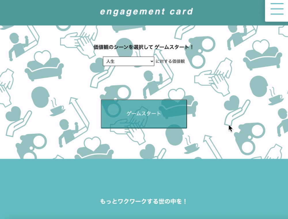 ・画面上で88枚の中から自分の価値観に合致するエンゲージメントカードを7枚選び、SNSでシェアできるような画像を作ることができます。