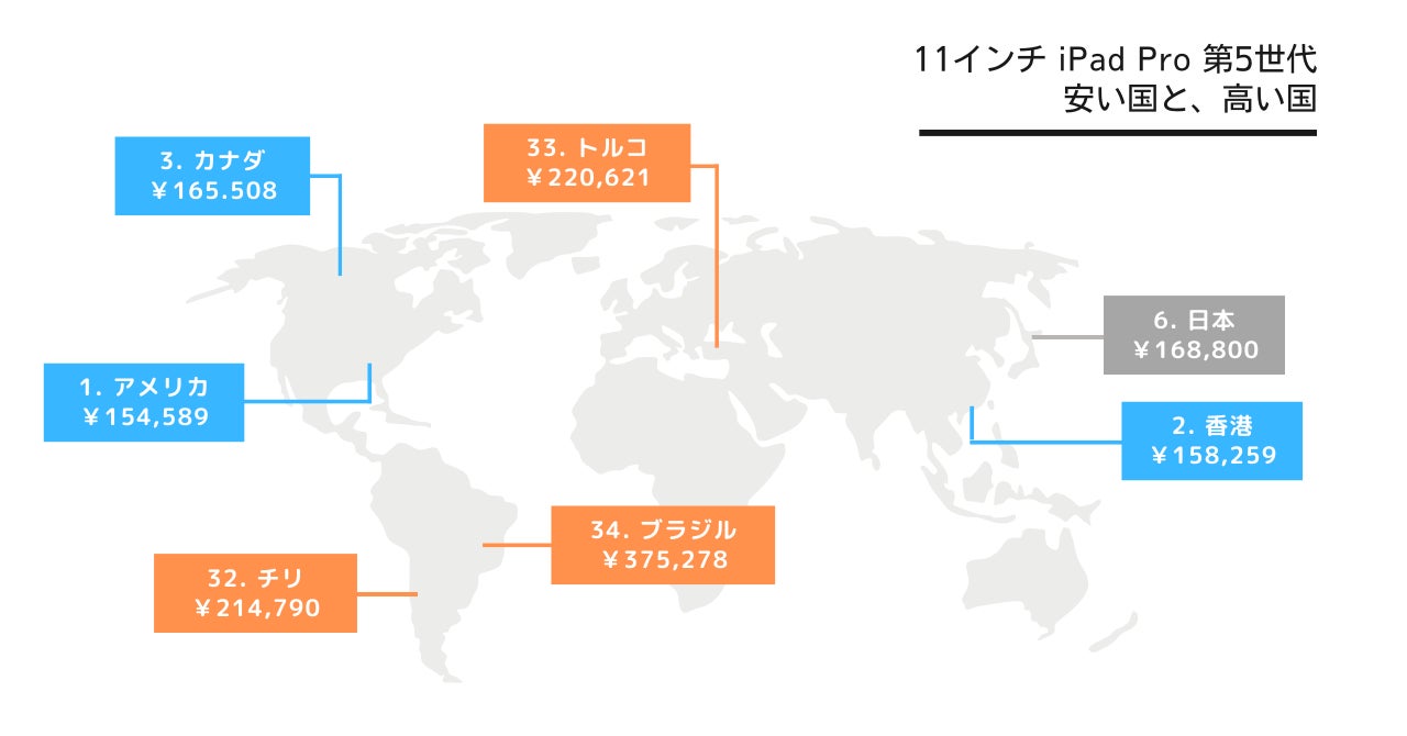 調査の結果、日本の価格の16万8,800円は、世界で6番目に安いことがわかりました。11インチ iPad Pro 第5世代全体で見ると日本は6~9番目に安いものの、前世代では4~6番目に位置していたため、わずかに順位が後退しています。最も安い国はアメリカの消費税非課税地域の15万4,589円で、日本よりも約1万4千円程安くなっています。最も高い国はブラジルの37万5,278円で、日本の倍以上の価格で発売される予定です。