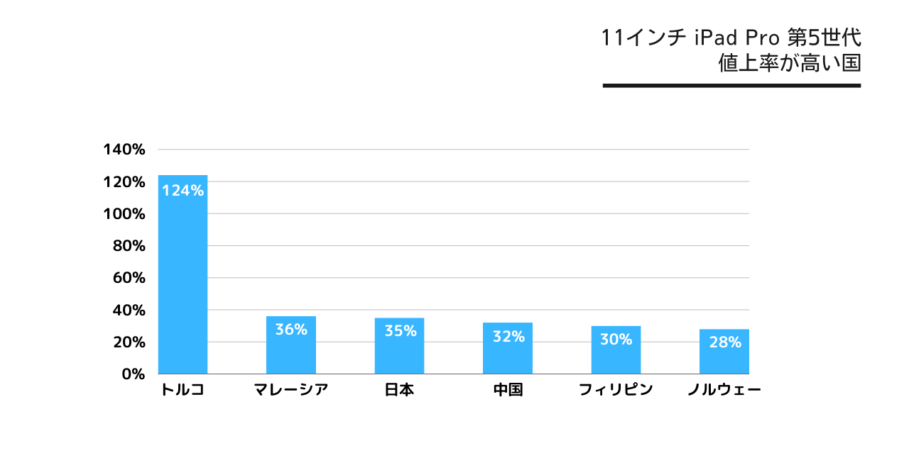 第5世代と、前世代である第4世代の開始価格を比較すると、日本では35%価格が上昇しました。ただし、基準国であるアメリカでも25%価格が上昇しているため、この開始価格の大幅な上昇は円安というよりも、最低ストレージ容量が128GBから256GBに引き上げられた影響が大きいと考えられます。124%もの値上率を記録したトルコは長年に渡る自国通貨の下落により、アップル製品の大幅な値上げが続いています。