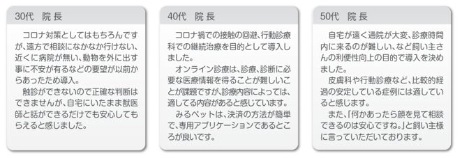 ヒトの医療では、2018年に厚生労働省によって「オンライン診療の適切な実施に関する指針」が策定され、これによって、臨床の現場でのオンライン診療の活用の基準が明確になりました。また、新型コロナウイルス感染症の影響でオンライン診療に関する議論が進み、今年のガイドラインと診療報酬の改訂では、初診の恒久化や報酬体系の整備がされました。