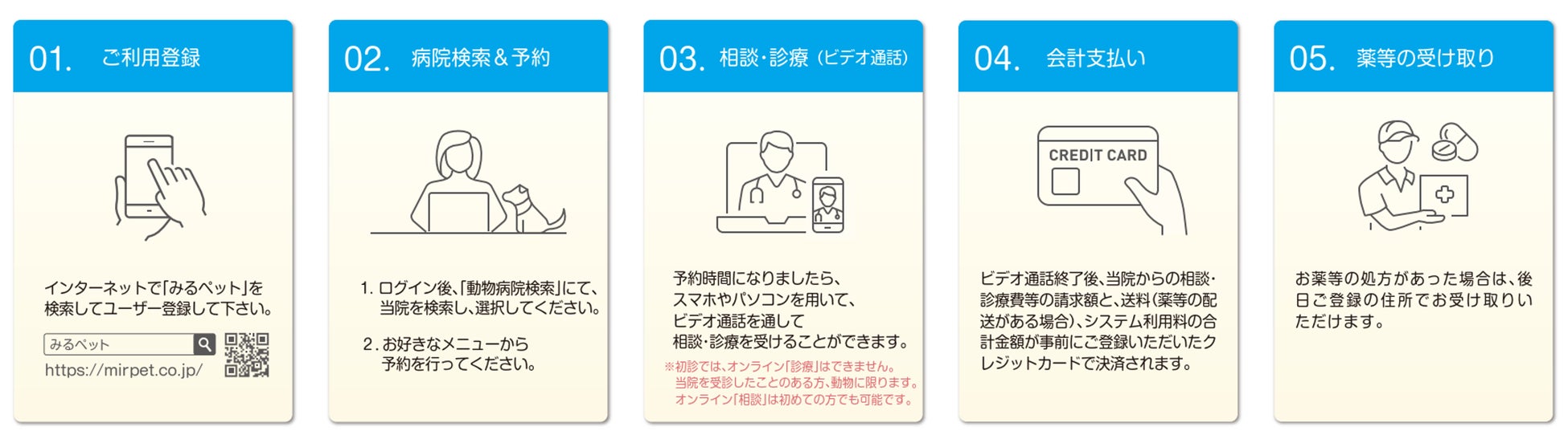 このような中で、動物たちの健康に必要な情報や医療へのアクセスのしやすさをどう向上させられるかを考え、オンライン相談・診療システム「みるペット」を開発・提供させていただいております。また、安心してオンライン診療を導入、利用していただくために現在の法的解釈の中でどのような運用ができるのかの情報も動物病院様に提供させていただいております。