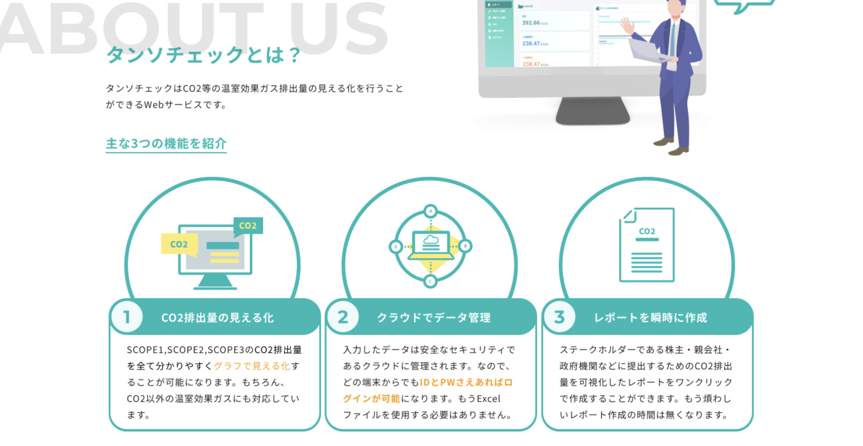 「タンソチェック」は業界初の無料SaaSツールであり、企業のCO2排出量をすべて見える化を実現。