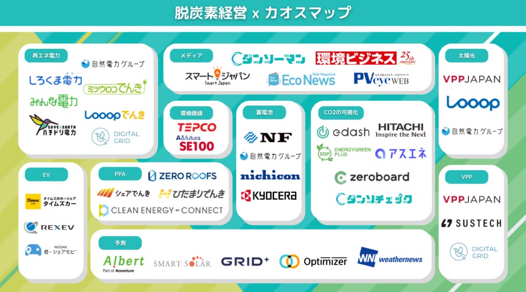 今回のカオスマップ公開にあたり、EV・再エネ・CO2の可視化など、脱炭素経営事業に取り組まれている様々な企業をピックアップしております。