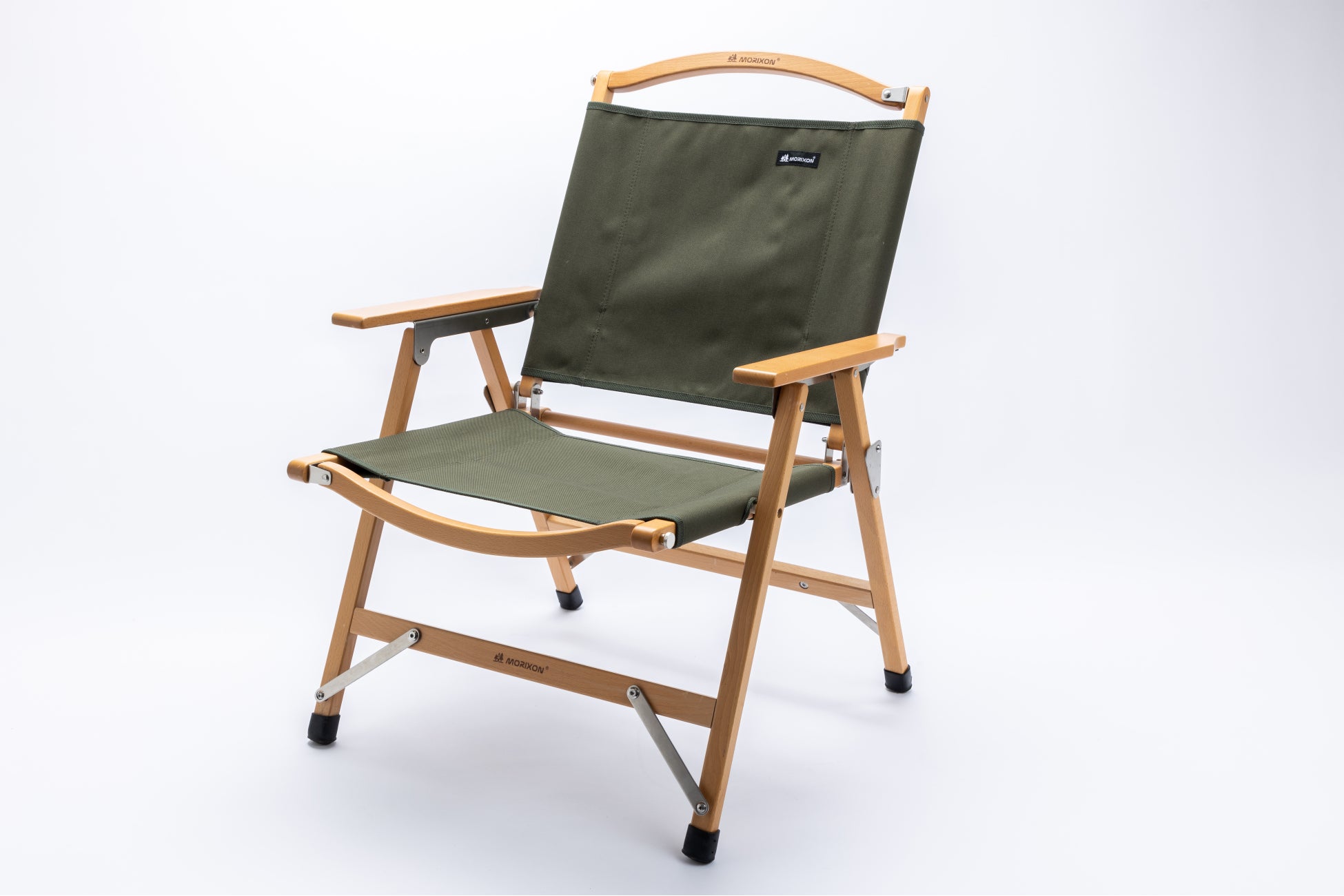 スタンダードな形状のキャンプチェア。一般的なキャンプチェアよりも一回り大きいサイズ感。幅が広く、座面も高いため窮屈さを感じず、座った状態からも立ち上がりやすい形状です。細かくパーツを分解できるので、非常にコンパクトに収納できます。バネを内蔵したネジを使用することで、工具不要で簡単に組み立て・分解が可能です。また、分解しなくても、薄く折りたたむことができるので、素早い展開、撤収が可能です。