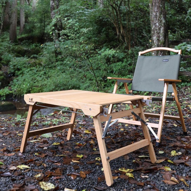 天板に取り外しが可能なウッドパネルを使ったキャンプテーブルです。天板を取り外した場所に、同じ台湾メーカーのバーナー※を取り付けることも可能で、機能的なキッチンテーブルとして使用できます。また、テーブルもチェア同様、細かく分解して収納することが可能で、展開時のサイズから考えると、驚きの収納サイズになります。また、テーブルの脚だけ折りたたんで薄い状態にすることも可能です。こちらもチェアと同様の機構を使っており、工具不要で簡単に組み立て・分解することができます。