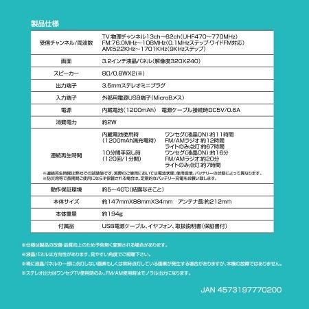 本機に内蔵されているバッテリーは満充電時でワンセグ視聴約17時間、FMラジオ聴取約12時間、AMラジオ聴取約14時間、LEDライト点灯約67時間の使用が可能です。