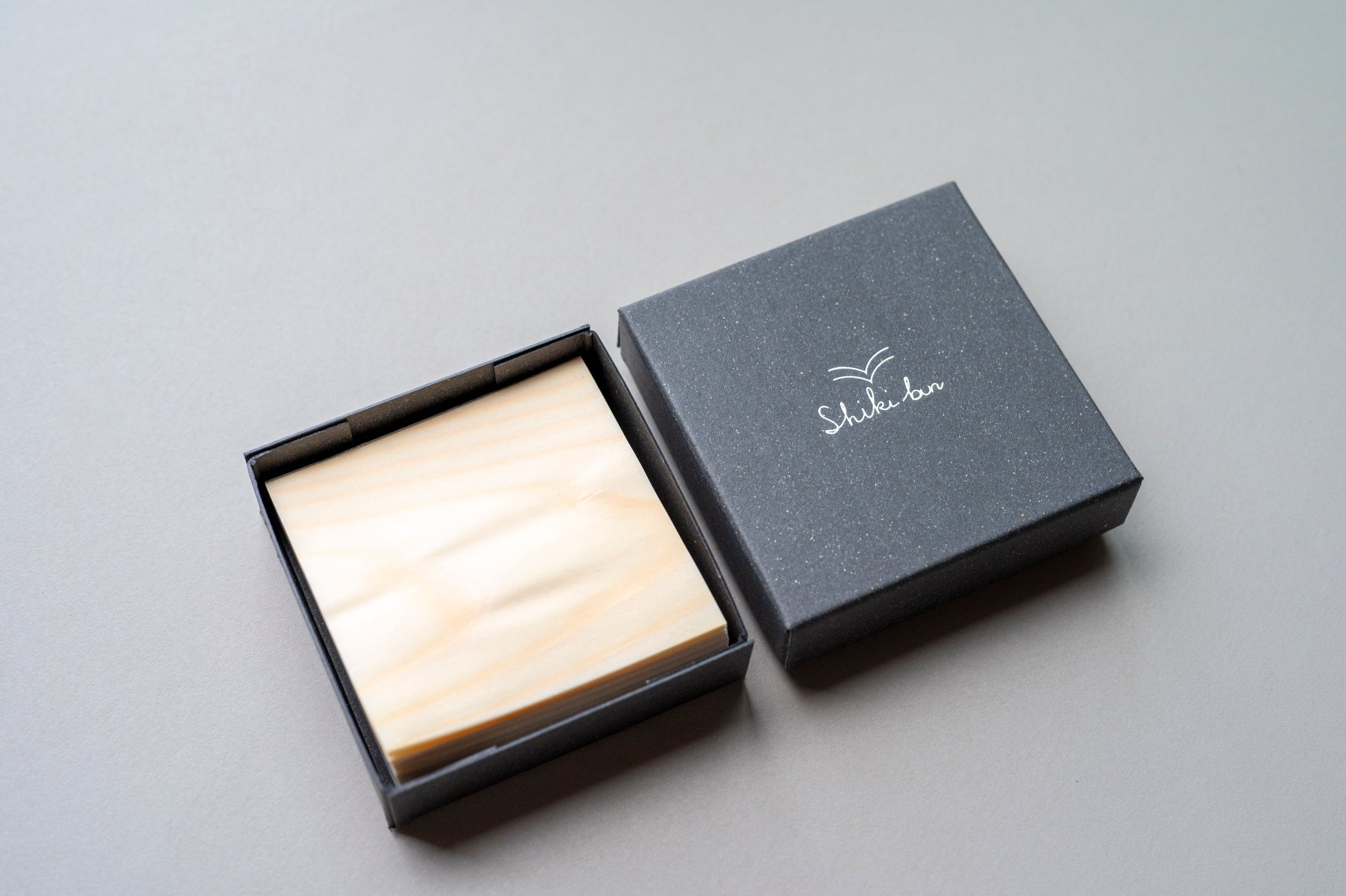 サイズは8cmx8cm。ページ数が80ページあるブロックメモは、断面から年輪が見え、コンパクトで愛らしいフォルム。小さなサイズながらも経木1枚1枚の重なりが印象的です。ささっとメモに使ったり、伝言メモやささやかなお手紙に使ったり。お茶菓子を出すときに敷くのもおすすめです。オリジナルの箱つきで、ギフトにも。