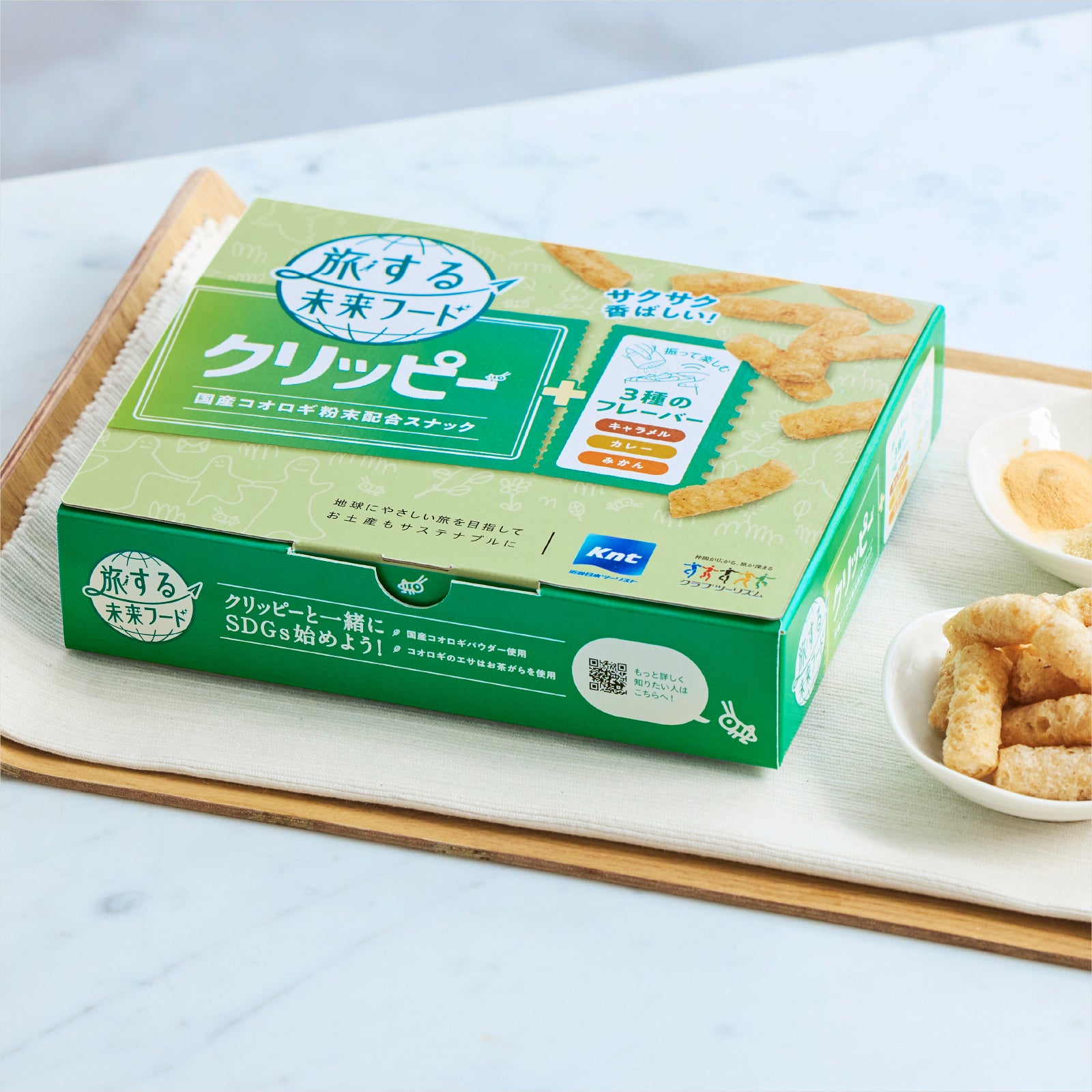 株式会社MNH(本社:東京都調布市 取締役社長:小澤尚弘、以下、MNH)は、KNT-CTホールディングス株式会社(本社:東京都新宿区 代表取締役社長:米田 昭正、以下、KNT-CT)とコラボレーションし、国産コオロギ粉末を配合したスナック『旅する未来フード クリッピー』を企画開発しました。