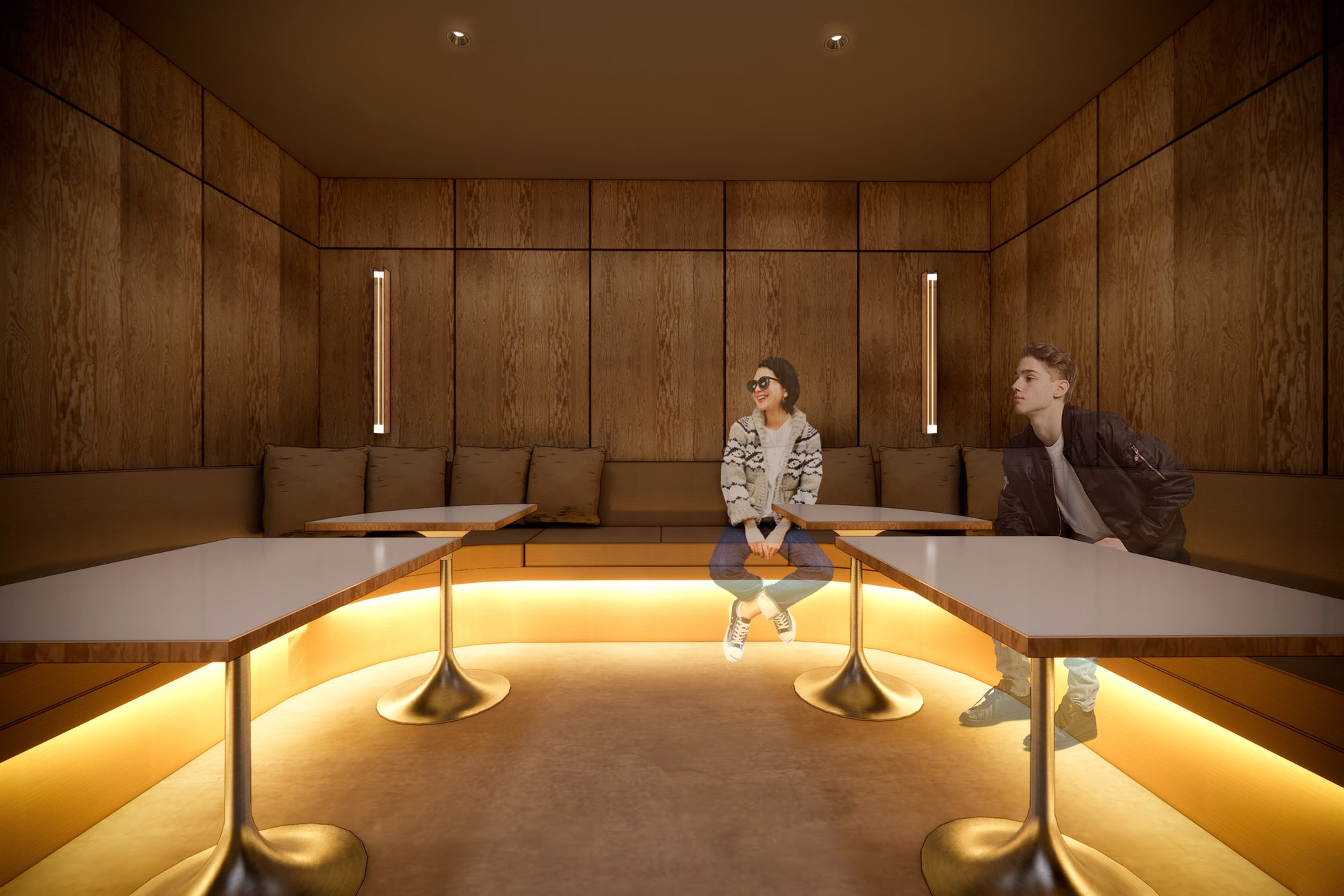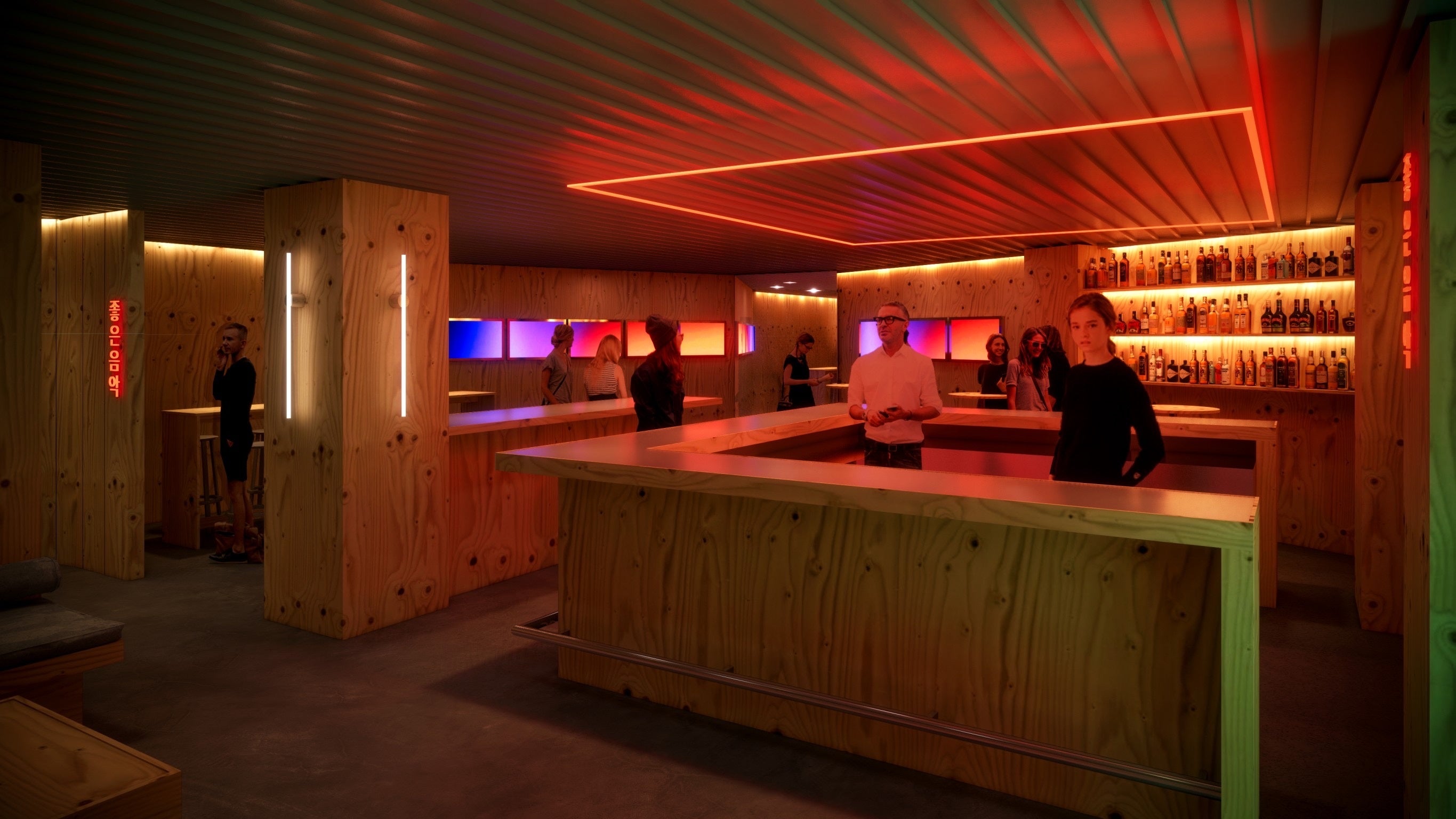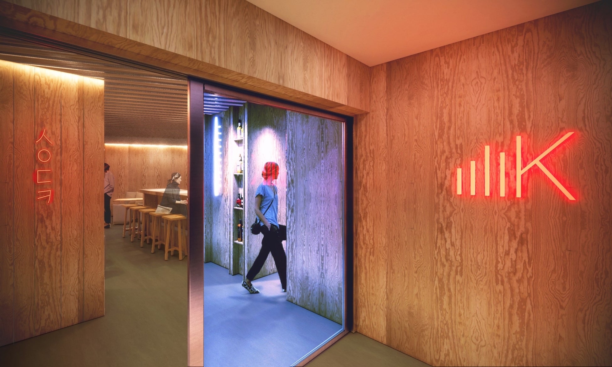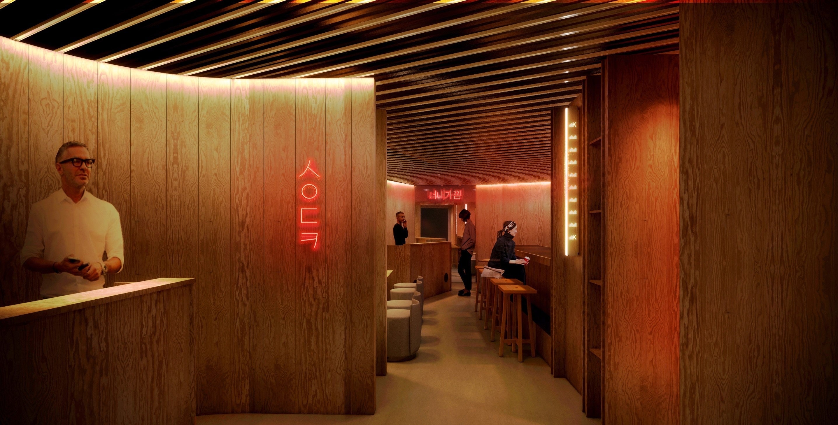 韓国・ソウルにいるような心地よいカルチャーバーを設計する。をコンセプトに、韓国の店舗とし装飾として象徴的なネオンサインを店内に散りばめながらも、ウッド(木材)を中心に構成する空間づくりをする事で、華やかでありながら落ち着きのある心地良い洗練されたミュージックバーに仕上げています。