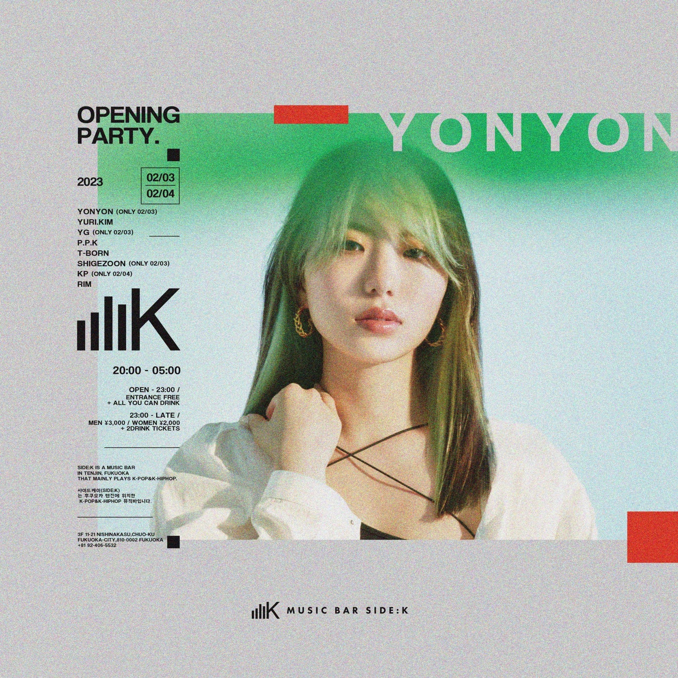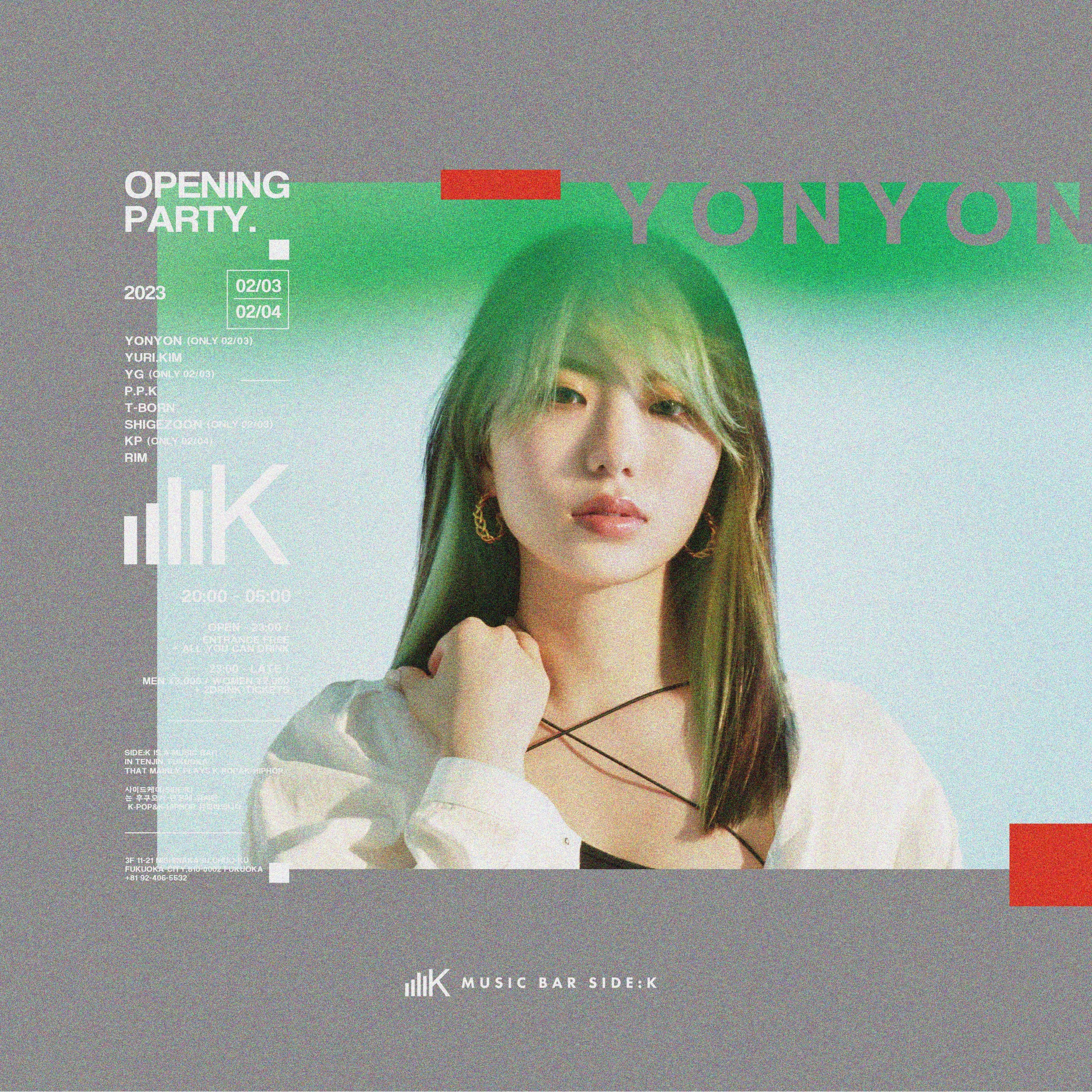 グランドオープンを記念しまして、2023年2月3日(金) - 4日(土)にオープニングパーティーを開催致します。K-POP,K-HIPHOPを得意とするDJが集結し、オープニングを彩ります。ゲストDJとしてYonYon(ヨンヨン)が出演致します。※2/3のみ