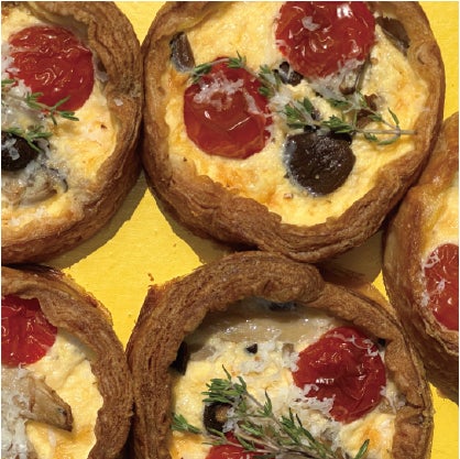 アパレイユのメインには、秋の味覚であるきのこを使用しました。きのこはオリーブオイルで香ばしく炒め、そこに自家製ローストチキンを加えて腹持ちを良くし、フレッシュトマトの酸味がアクセントとなり、さっぱりお召し上がりいただけます。キッシュ生地は当店自慢のクロワッサン生地を使用しています。