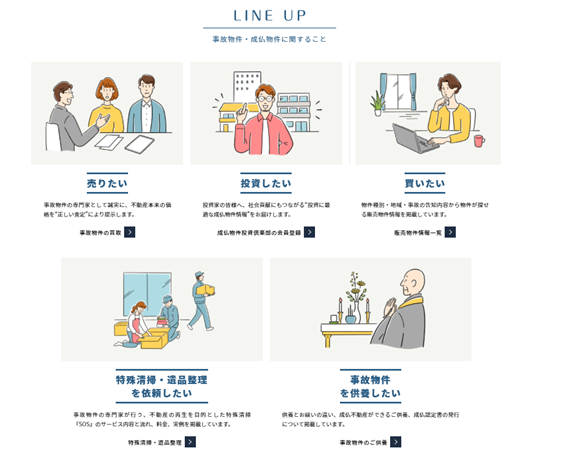 また、国内最大級の事故物件総合取り扱いサイトとして、事故物件所有者の困りごとである特殊清掃や遺品整理、供養といったページへのアクセス導線を強化致しました。