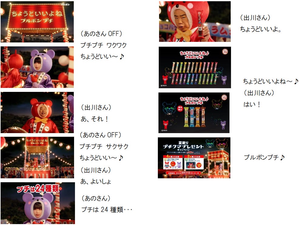 ブルボンの人気キャラクター“プチクマ”の被り物と法被を身にまとったあのさんが、夏祭り会場のやぐらで『プチ音頭』を歌い、その横で出川哲朗さんが太鼓をたたきながら合いの手を入れています。やぐらの下では音頭に合わせて老若男女が盆踊りをしており、ブルボン「プチシリーズ」が全ての人にちょうどよく、気軽に楽しめる商品であることを表現しています。さらにあのさんの「プチは24種類」というセリフの後に出川さんが「ちょうどいいよ!」と言うことで、味の豊富さもアピールし、誰でもどこでも美味しく食べてほしいという願いを込めたCMとなっています。