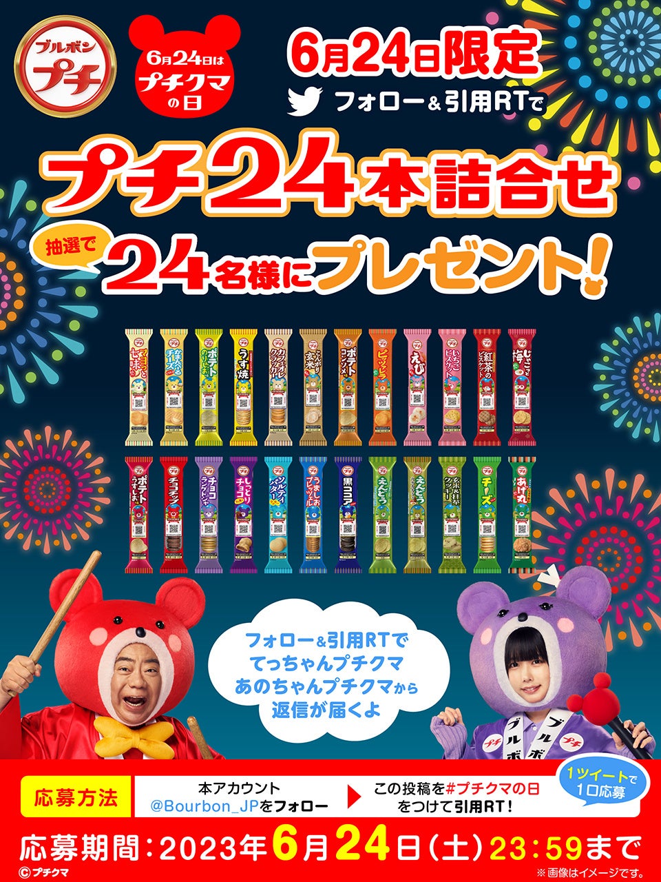 プチシリーズのキャラクター“プチクマ”が誕生したのは2011年6月。商品ラインナップの“24種類”にちなんで6月24日を「プチクマの日」と定め、お客様に楽しんでいただける取組みを実施しております。今年は6月24日限定で、Twitterにてフォロー&引用リツイートキャンペーンを実施し、合計24名様に「プチ24本詰合せ」をプレゼントいたします。