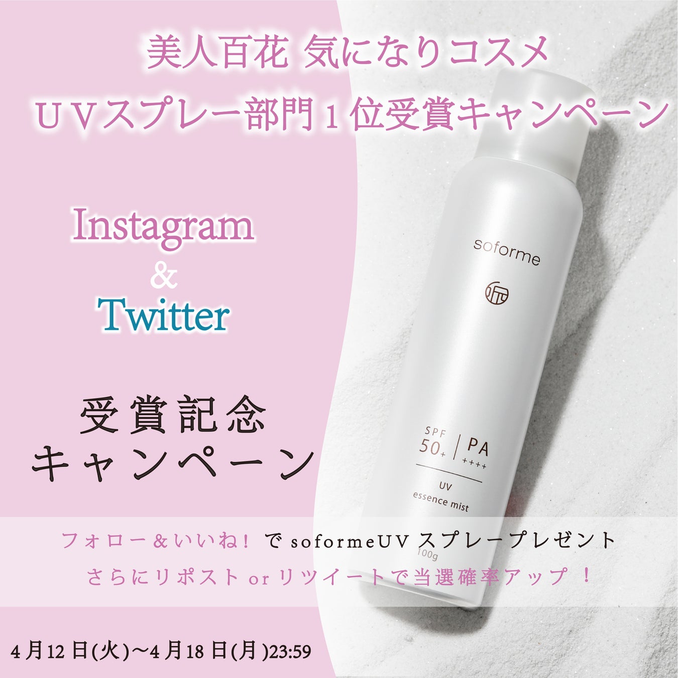 人気商品「soforme エッセンスUVミスト」が”美人百花”気になりコスメUVスプレー部門1位を受賞!記念して4月12日(火)よりSNSキャンペーン開催!