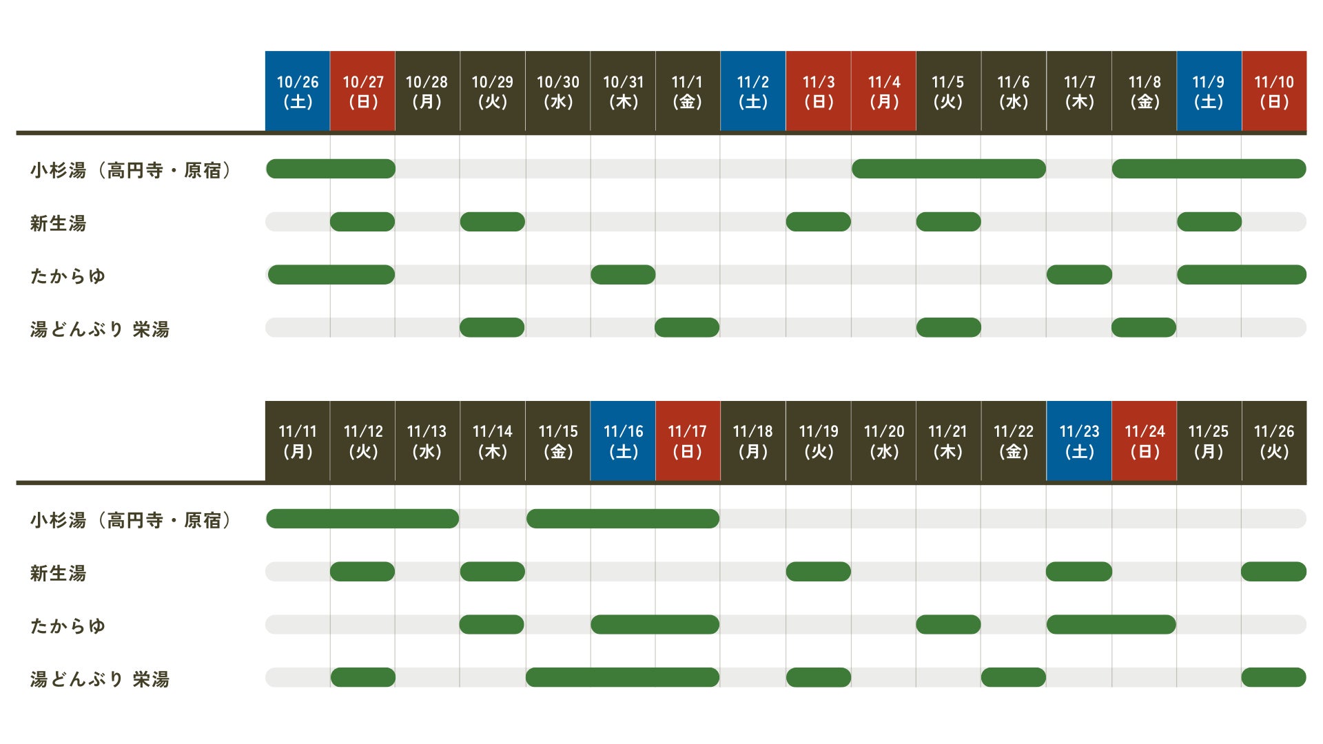 ※10/28, 10/30, 11/2, 11/18, 11/20, 11/25は、替わり湯およびスタンプラリーはお休みです。