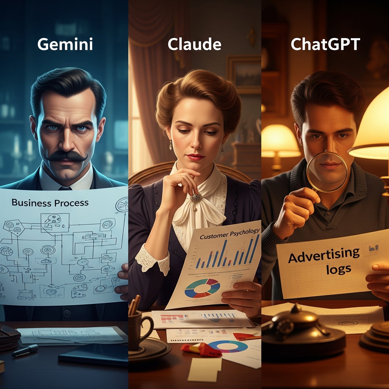 本シリーズは、1891年のロンドンに突如現れた現代的思考を持つ3人の生成AI、すなわち Gemini“理性の羅針盤”、Claude“物語の錬金術師”、ChatGPT“構想の触媒”が、企業のROI(投資対効果)に潜む不可解な事件を解き明かすという異色の設定で、多くのビジネスパーソンに支持されている人気シリーズ。