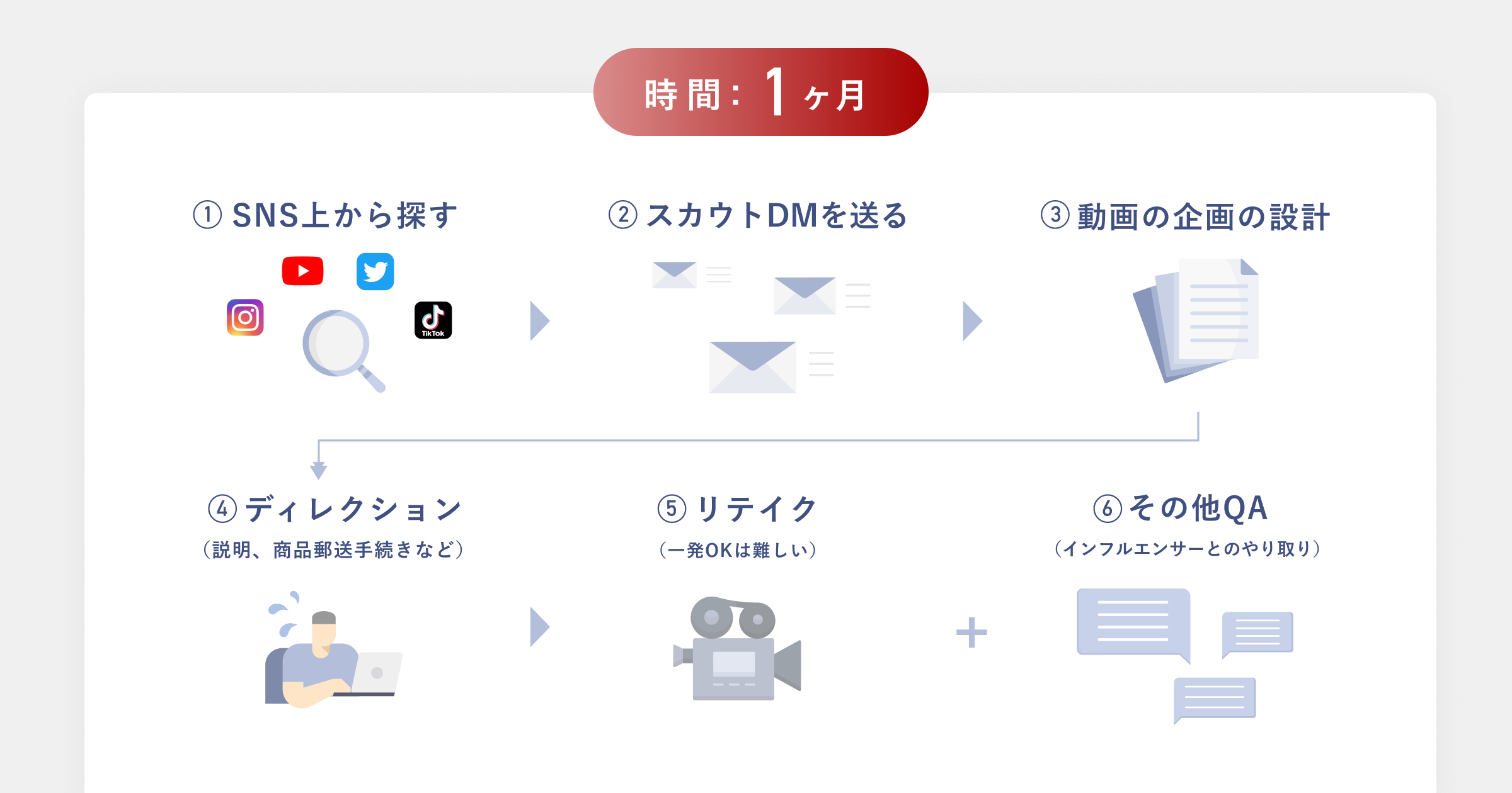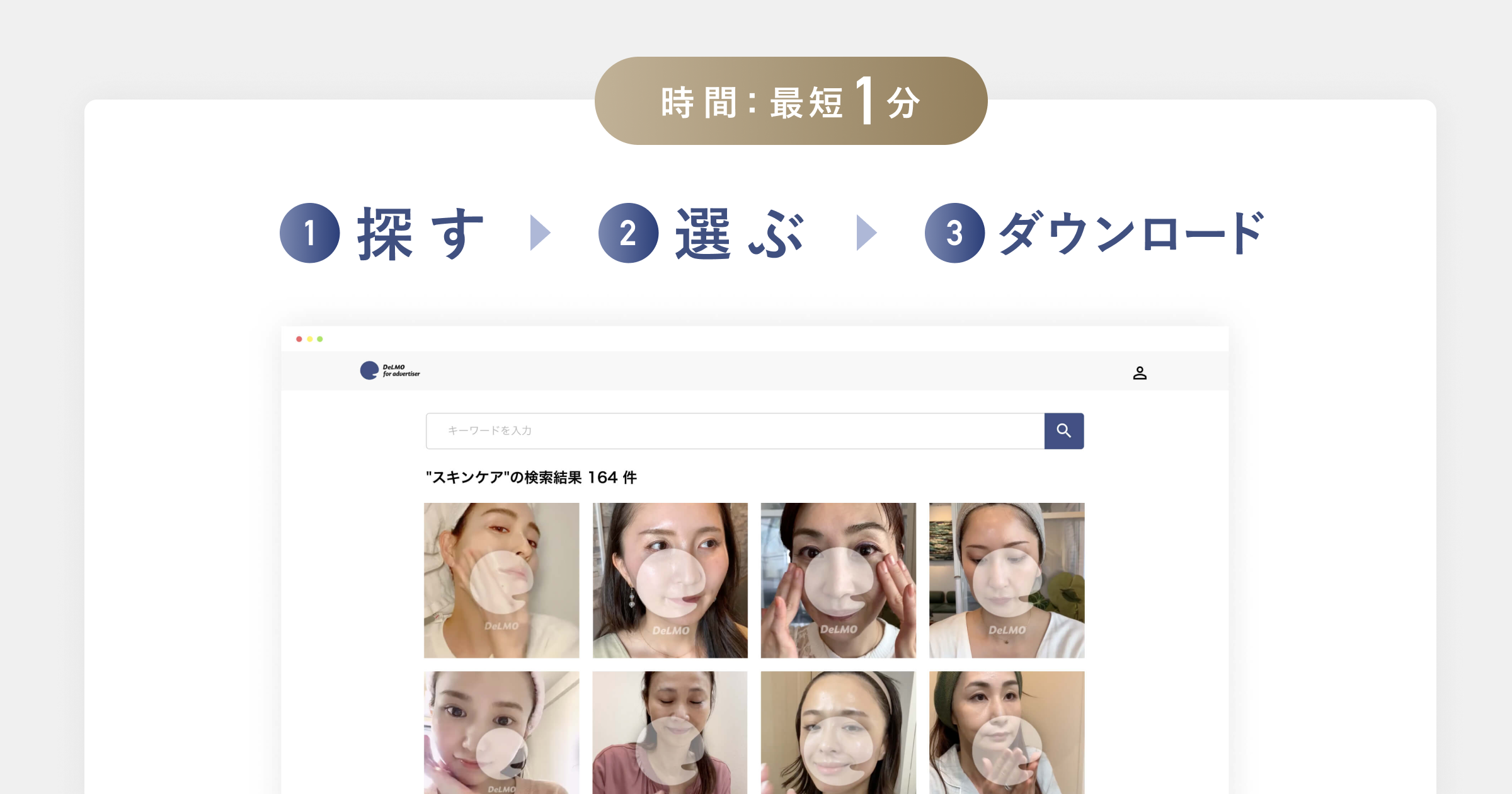 従来、動画広告のクリエイティブ制作に必要な動画素材を収集するためには、キャスティングや撮影内容の企画設計、ディレクション、撮影実施、リテイク、モデルからの質問対応など、素材収集の完了まで最低でも 1ヶ月程度かかっておりましたが、DeLMOを使用することにより、素材収集の完了までを最短1分程度に短縮することができます。