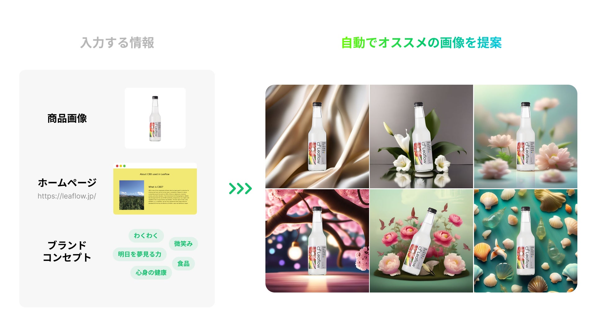キャンペーンやシーズンごとで撮影が必要になるサイト内や広告の商品画像の作成を、生成AIの技術を用いて自動生成できる点が特徴です。商品の画像をアップロードし、作成したい商品のイメージを文字で入力もしくはテンプレートを選択するだけで、クリエイティブな商品画像を短時間で作成することが可能です。また、花や果物、土台や手など、素材を自由に配置し、思い通りの構図で商品画像を作成することも可能です。