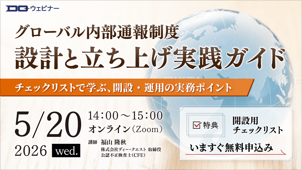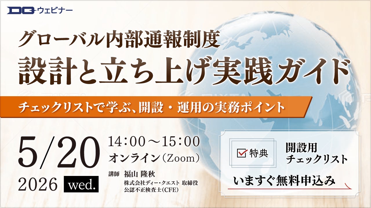株式会社ディー・クエスト(本社:東京都千代田区、代表取締役:脇山太介)は2026年5月20日(水)14時より、無料ウェビナー《グローバル内部通報制度の設計と立ち上げ実践ガイド:チェックリストで学ぶ、開設・運用の実務ポイント》を開催します。