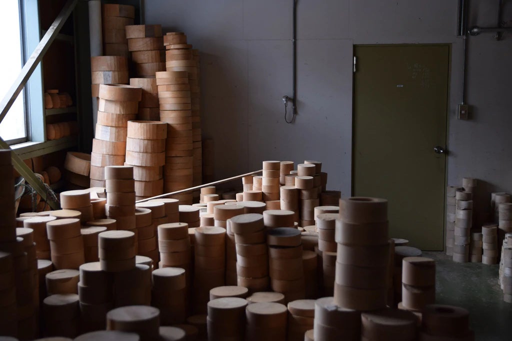 モクシェラを作るのは石川県の山中温泉地区に拠点をかまえる畑漆器店。日本の伝統技術を継承する、由緒ある工房です。円盤状に成形した木の塊を、木地師と呼ばれる職人が手と目の感覚で器の形に削り出していきます。