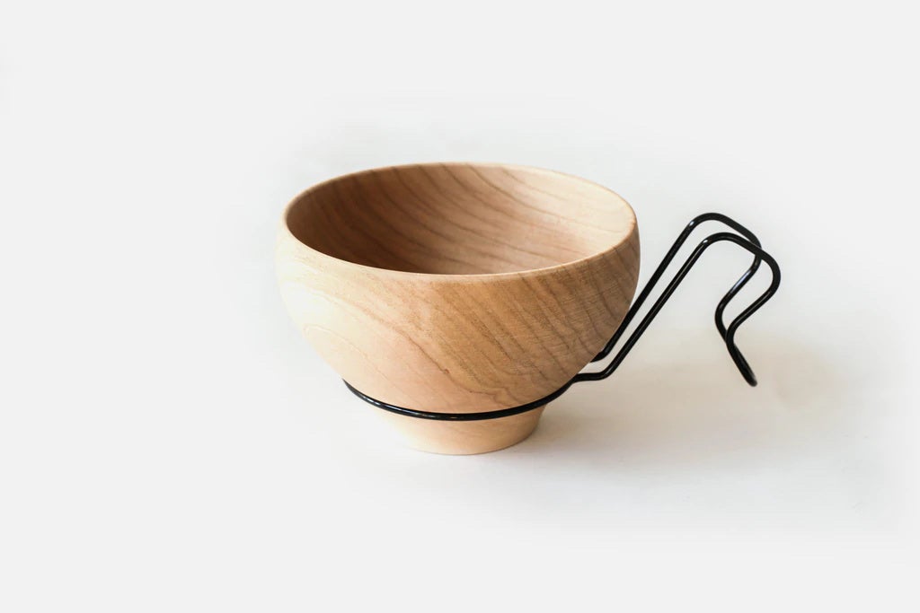 野生種の山桜(やまざくら)を素材に使った木製シェラカップ。「轆轤(ろくろ)挽き」と呼ばれる、日本古来の伝統技法によって一つずつ丁寧につくられています。