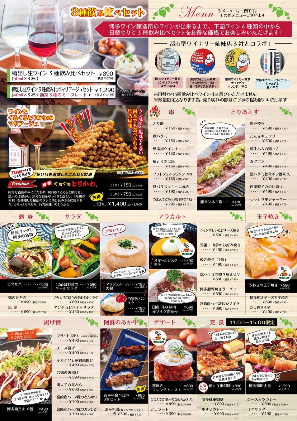 月間80万本売り上げる「博多ぐるぐるとりかわ」など居酒屋竹乃屋の焼き鳥をはじめとする料理と、ソムリエのセレクトワインをお楽しみいただけます。(店内醸造のワインは9月頃より提供予定)