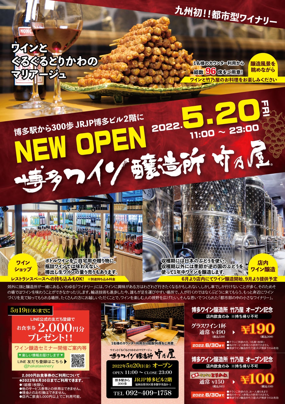 株式会社タケノ(本社:福岡市博多区博多駅南、代表:竹野孔)は、九州初となる都市型ワイナリー「博多ワイン醸造所 竹乃屋」を、JRJP博多ビル2階に2022年5月20日(金)オープンします。ワインとぐるぐるとりかわのマリアージュをテーマに、博多の焼鳥をセレクトワインと楽しめるワイナリー併設の居酒屋。6月から店内醸造所でワイン醸造を開始予定で、9月頃には店内醸造した樽出し生ワインもお楽しみいただけます。