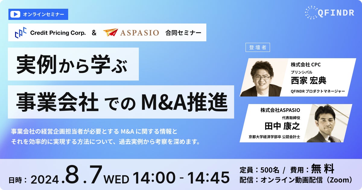 金融コンサルティング会社である株式会社クレジット・プライシング・コーポレーション(東京都中央区、代表取締社長:鈴木洋壹 以下:CPC)は、M&Aアドバイザリーを行う株式会社ASPASIO(アスパシオ)(東京都港区、代表取締役:田中康之 以下:アスパシオ)と、合同セミナー『実例から学ぶ事業会社でのM&A推進』を2024年8月7日(水)にオンライン開催いたします。