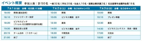 7月初旬、金曜の夜から日曜の夜までの3日間。名古屋青年会議所会員企業の経営資源を活かして、チーム毎(10チーム)に新規ビジネスのプロトタイプまで仕上げます。最終日に、3日間の成果発表として、ビジネスコンテストを開催しますので、ぜひ取材へお越しいただきますようお願い申し上げます。