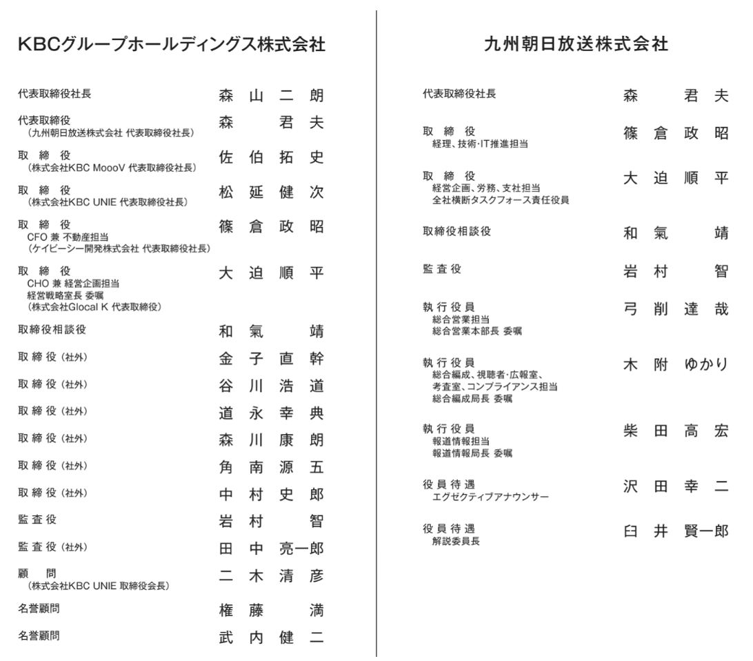 4月1日付で発足した持株会社KBCグループホールディングスの代表取締役社長に森山二朗(旧・九州朝日放送 専務)、放送事業会社となる新しい九州朝日放送の代表取締役社長に森君夫(旧・九州朝日放送 専務)がそれぞれ昇格しました。現在の九州朝日放送・代表取締役社長の和氣靖は両社の取締役相談役に就きました。