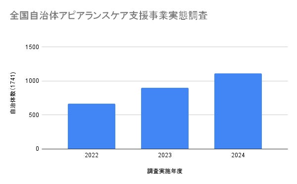 2024年6月ー8月に行った当法人の調査により、アピアランスケア支援事業としてなんらかの助成を市区町村および都道府県が行なっている自治体は全体(1741市区町村)の64%(1114市区町村)という結果になりました。2022年度に調査した際の38%(669市区町村)から比較すると、この3年間で実施自治体が増加していることがわかります。
