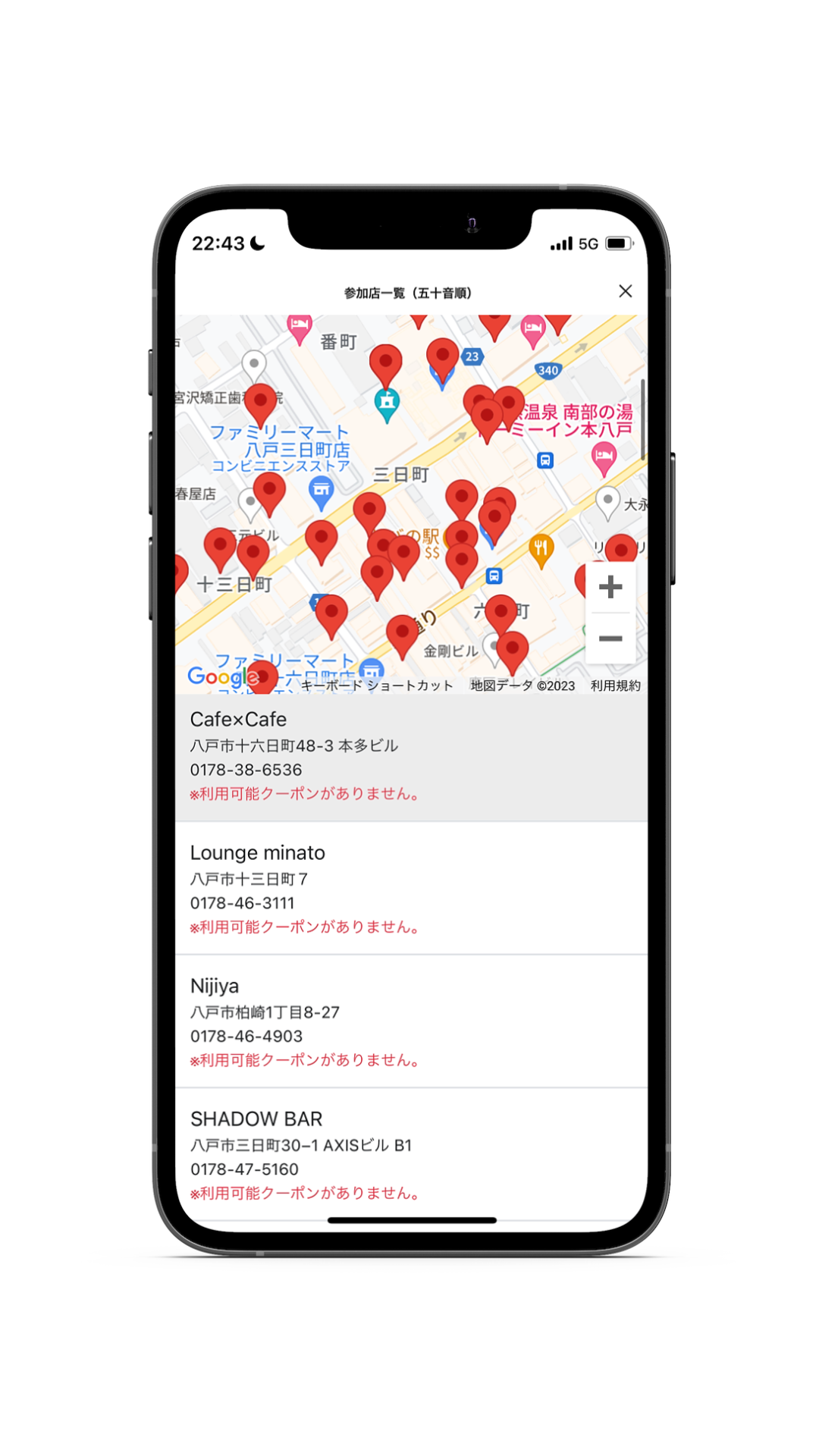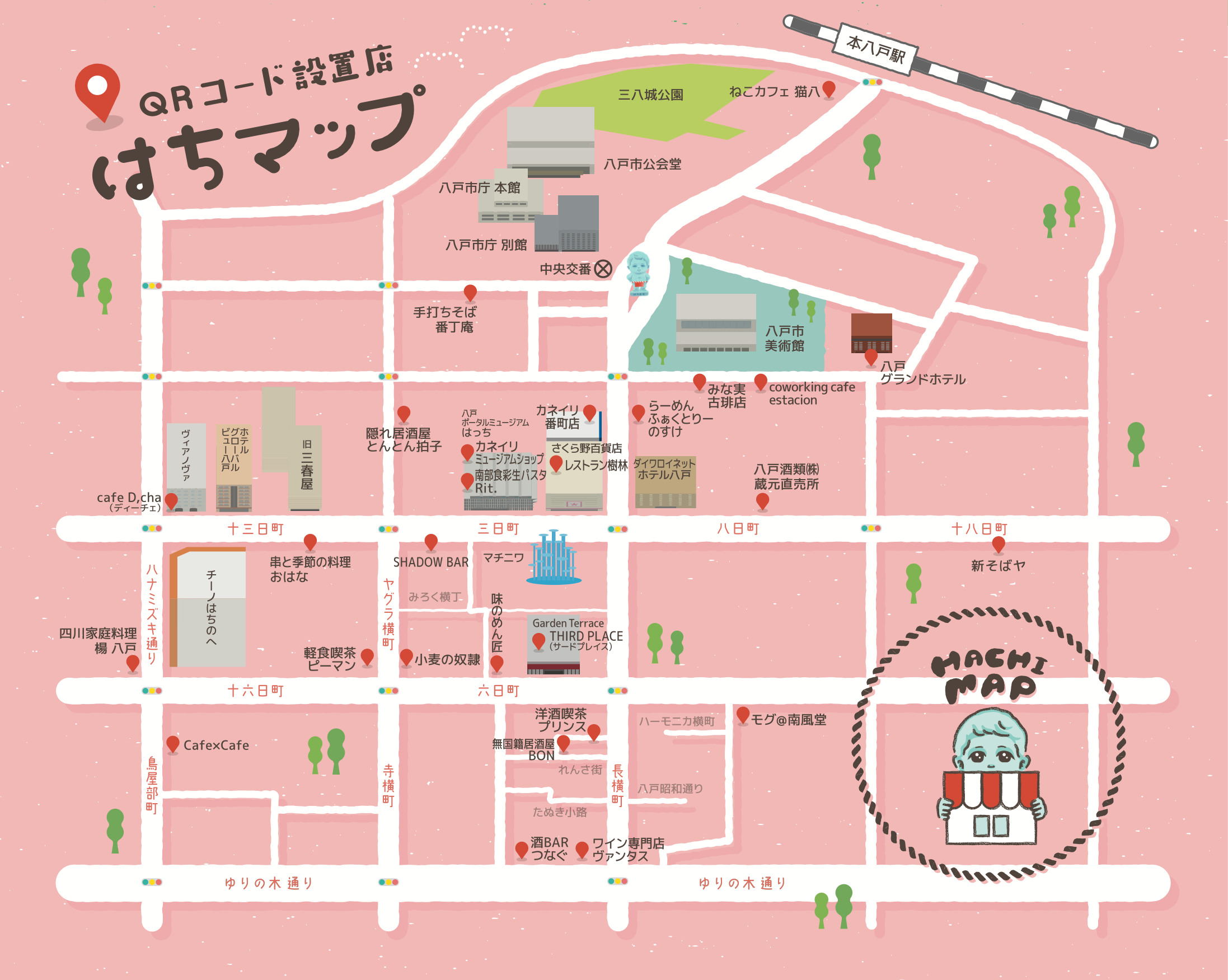 Cafe×Cafe/THIRD PLACE(サードプレイス)/ねこカフェ 猫八/みな実古琲店/カネイリミュージアムショップ/カネイリ番町店/coworking cafe estacion/SHADOW BAR/ワイン専門店 ヴァンタス/八戸酒類㈱蔵元直売所/南部食彩生パスタ Rit. /味のめん匠/喫茶ピーマン/四川家庭料理 楊 八戸/洋酒喫茶プリンス/無国籍居酒屋BON/酒BARつなぐ/隠れ居酒屋 とんとん拍子/レストラン樹林 /cafe D,cha (でぃーちぇ) /モグ@南風堂/新そばヤ/八戸グランドホテル/小麦の奴隷 八戸店/手打ちそば番丁庵/おはな /らーめんふぁくとりーのすけ