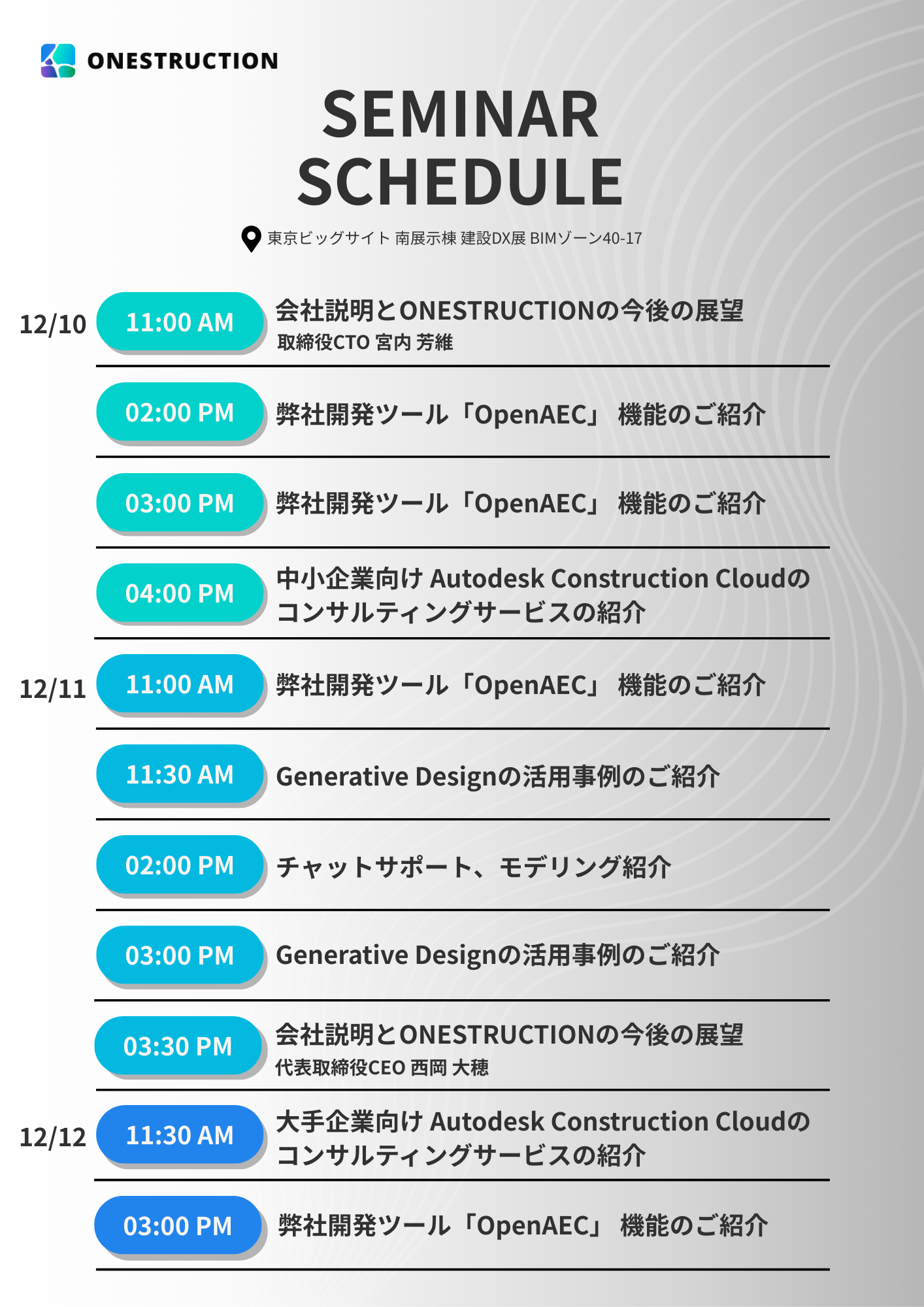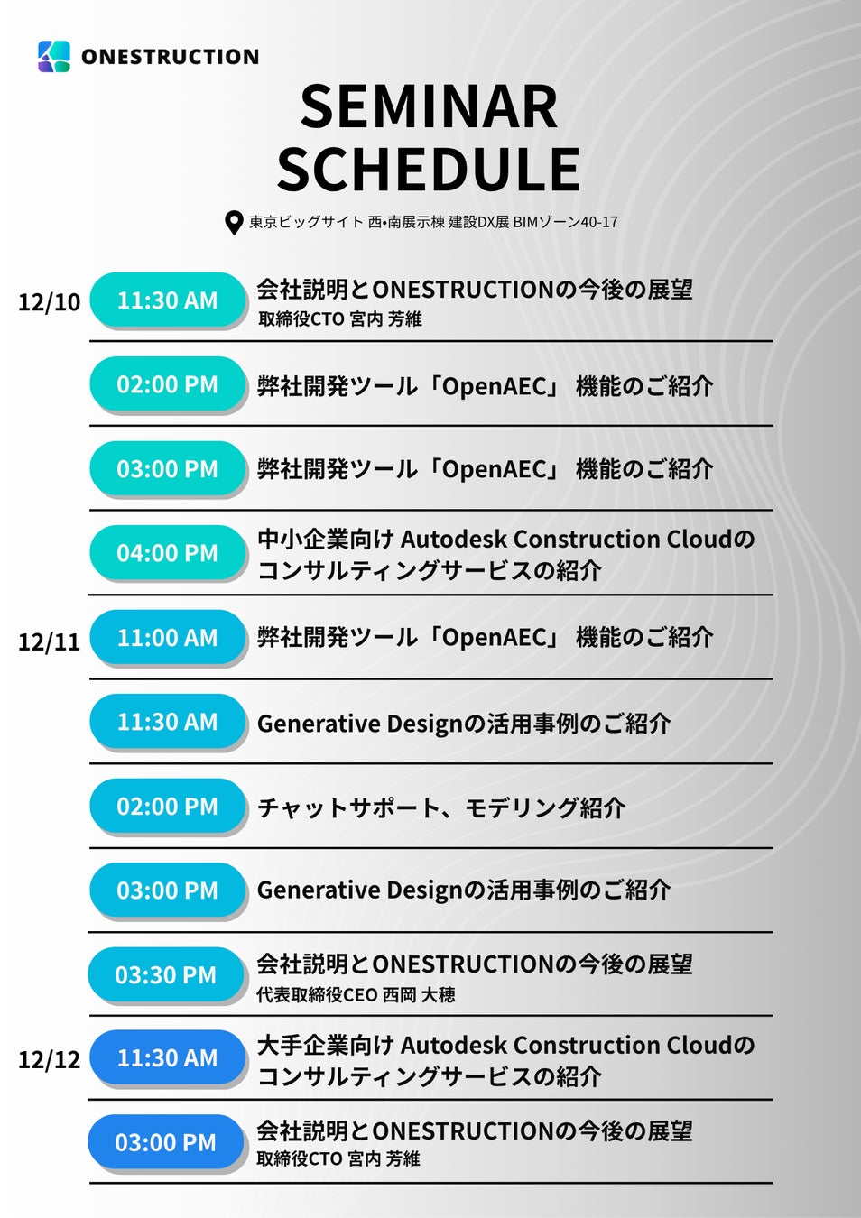 弊社ブース内では、役員及び各事業推進者による短時間のミニセミナーを複数回実施します。立ち寄りやすい形式で、OpenAECの機能のご紹介や各サービスや事例のご紹介などを行います。