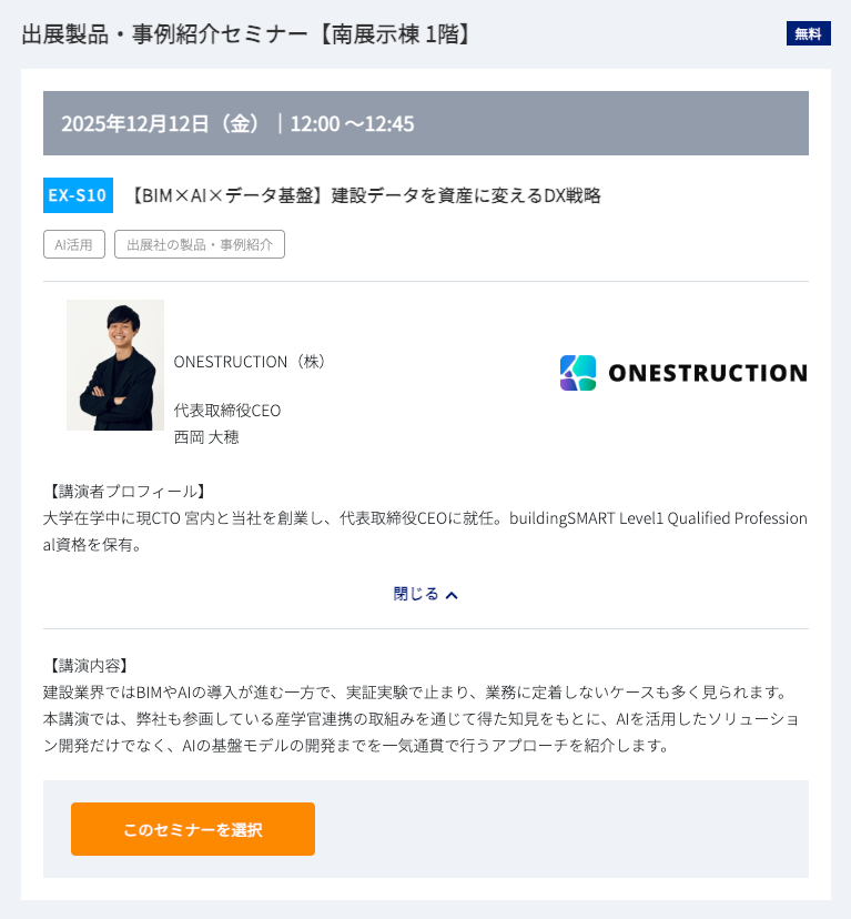 東京ビックサイト南展示棟 1階にて、弊社代表取締役CEOの西岡大穂が「【BIM×AI×データ基盤】建設データを資産に変えるDX戦略」と題してセミナーに登壇いたします。