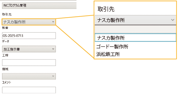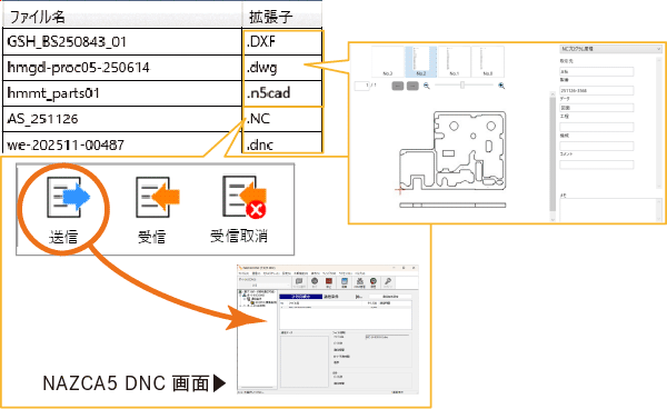 通信ソフト(NAZCA5 DNC)と連携し、登録されているNCプログラムをそのまま機械へ送信できます。また、機械からNCプログラムを受信すると同時に、該当データに上書きして改定管理まで自動で行えるため、加工後の実績あるNCプログラムを確実に管理していくことができます。