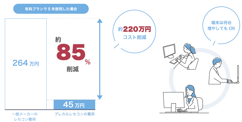 プレカルレセコンを5年間使用した場合、コストは従来の約1/10に。1ライセンスさえあれば複数端末で同時に利用することもできます。