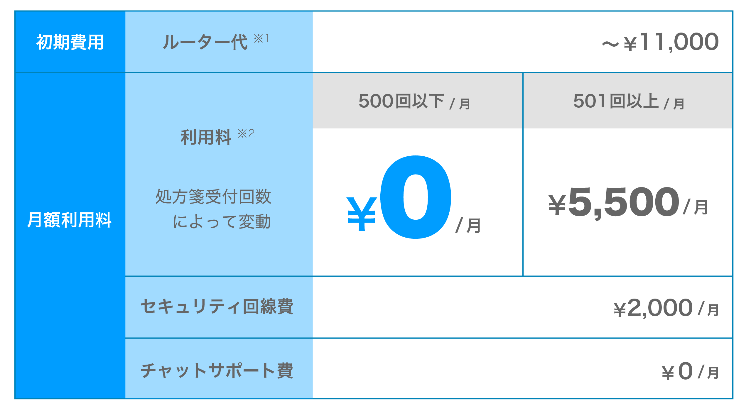 処方箋の受付回数が月に500回以下の場合、月額利用料は0円。