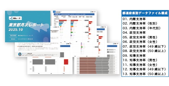 内閣支持率・不支持率の日次推移、主要政党支持率の日次推移、属性別(性別・年代別・地域別等)のクロス集計データ、トレンド分析資料、調査概要(サンプル数、調査手法、調査期間等)等。