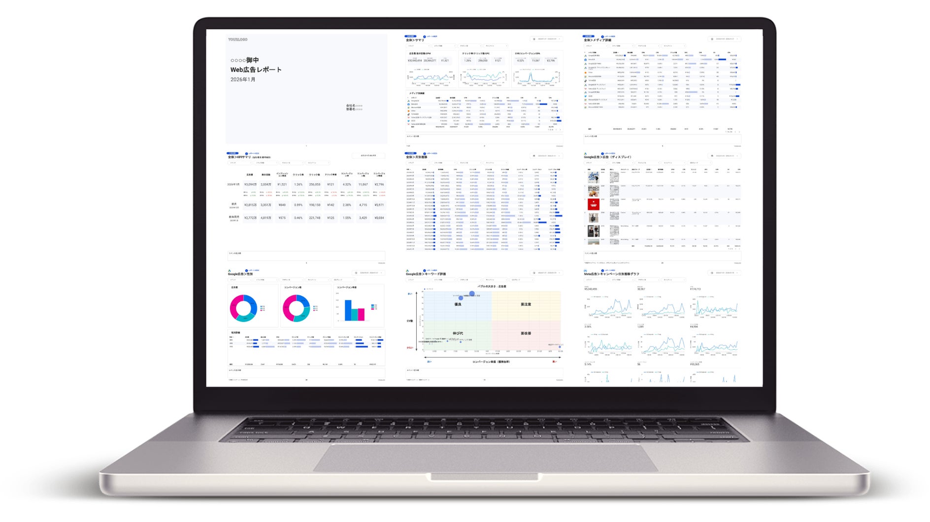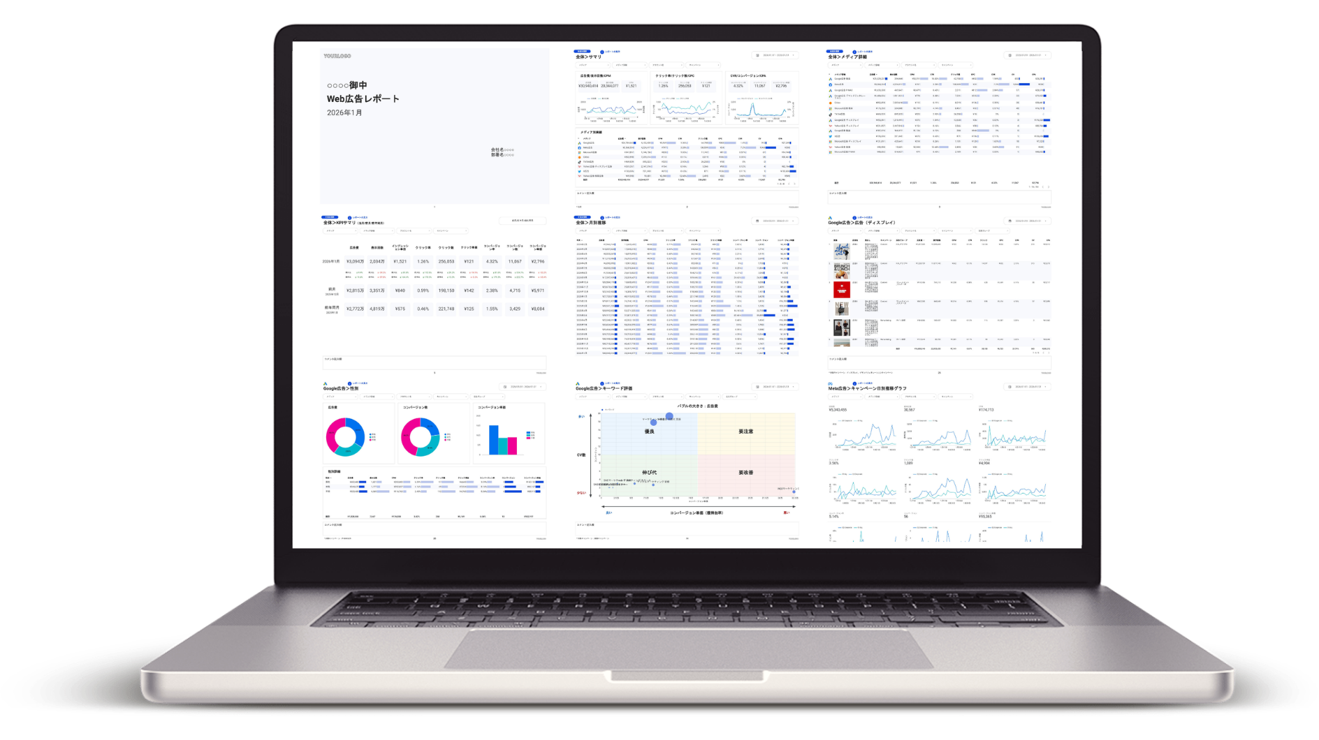 Google、Meta、Yahoo!、LINE、TikTok、Xなど、33種類以上の広告媒体の公式APIを通じてデータを自動取得。実績の全体サマリからキャンペーンや広告グループ、クリエイティブ画像レポート、キーワード、オークション分析、バブルチャート評価まで、183ページにわたる網羅的なレポートが「毎朝自動で」更新されます。