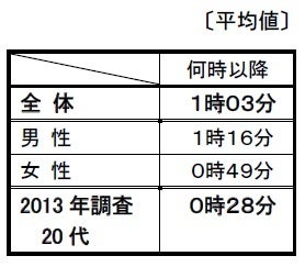 2013年に実施した同様の調査で20代(20歳~29歳)の回答は、0時28分でしたので、現在のZ世代の方が30分ほど遅くなっています。