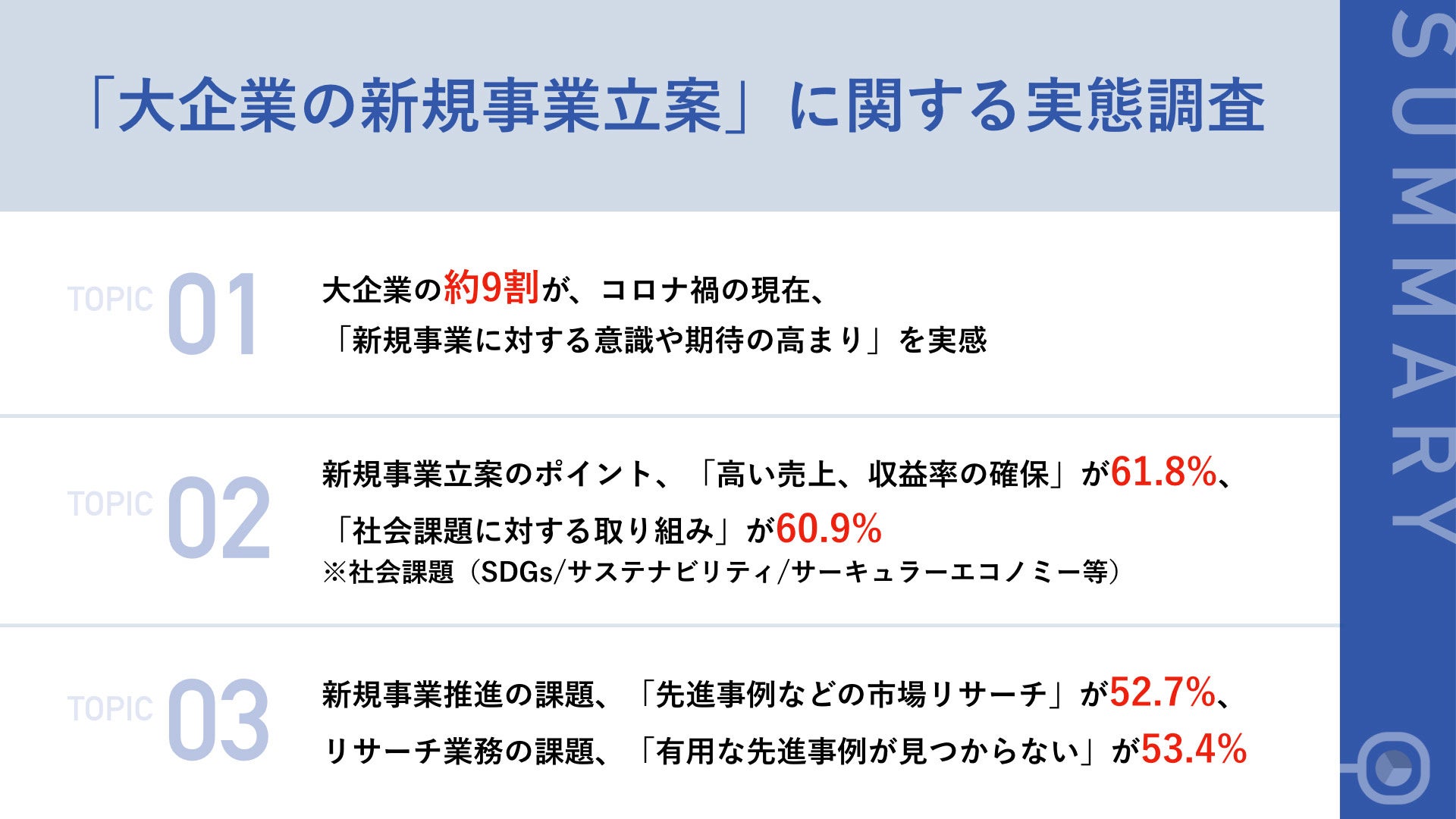 今回の調査では、長引くコロナ禍の真っ只中で、大企業の新規事業責任者が、新規事業に対する意識や期待の高まりを実感していることが判明しました。昨今、SDGs等の社会課題が、メディアで多く取り上げられていますが、これらの社会課題と新規事業を関連付けるケースが増えているようです。そのような中で、新規事業担当者としては、参考となる先進事例が見つからないというリサーチ時点での課題や、これまでの常識からは逸脱するような斬新な発想の転換などに、頭を悩ませている実態が明らかとなりました。新規事業は社内で検討を進めるだけでなく、社外からも専門家の視点を取り入れるなど、幅広い知見を取り込む体制が重要だと言えるでしょう。