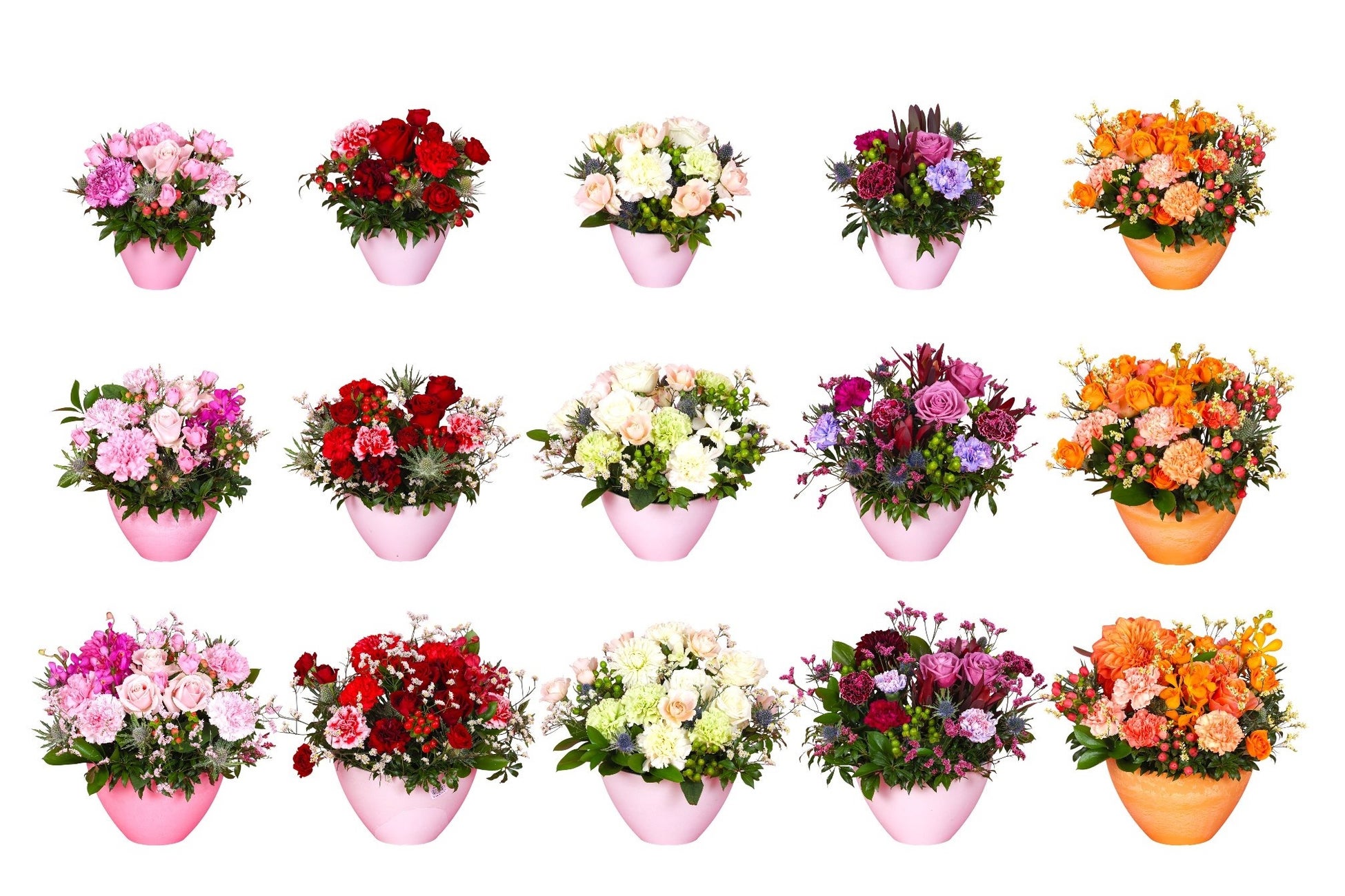 リサイクル原料の石材やプラスチックなどの素材の粉末を混合した地球にやさしいサスティナブルな素材をアレンジメント用花器に採用。陶器のような質感と、軽量かつ柔軟性のある丈夫な樹脂の特性を併せ持っています。耐候性に優れ、耐酸化性や耐食性があり、水漏れしないため、セロファンシートが不要になり、温室効果ガスの抑制に貢献できます。
