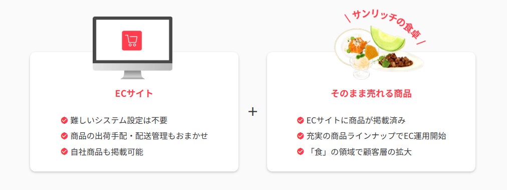 掲載商品は、グルメカタログ「サンリッチの食卓」掲載商品を中心に構成され、お客様は商品在庫を抱える必要がなくECサイトへの商品登録作業も必要ありません。また、お客様の自社商品との組み合わせ販売にも対応し、オリジナリティのあるEC展開も可能です。
