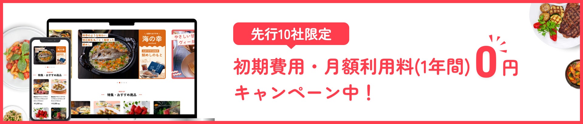 「おまかせECマルシェ」は、グルメ商品が130点以上掲載済み+自社商品も掲載できる商品ラインナップを充実させた状態でECサイトを構築できるサービスです。