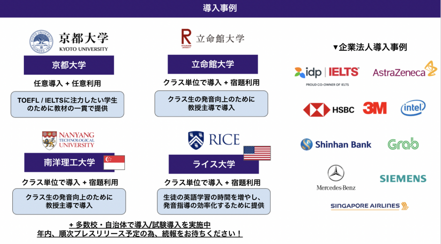 日本においては、文部科学省の指導要領の変更に伴う教育現場でのスピーキング指導の必要性に応えるため、2020年より事業活動を開始しております。現在、日本国内では60万人にご利用いただいており、英検・IELTS・TOEFL受験者のスピーキング対策や、TOEIC受験者のリスニング対策として、高い評価を得ています。