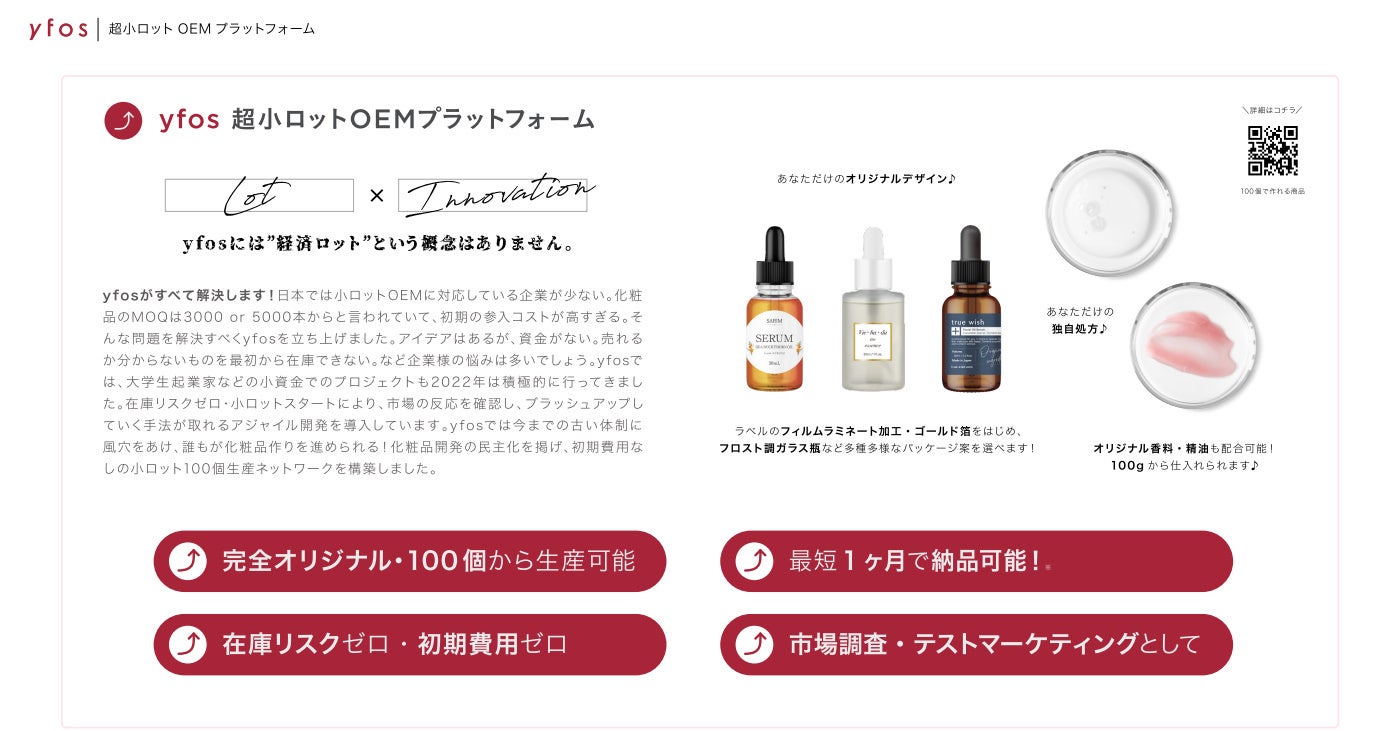 yfosでは早期のグローバル化に向け「世界の化粧品を高品質で、スピーディーにつくれる世の中にする」を掲げ、そのために日本、韓国、台湾、ベトナム、タイ、中国、香港などの世界各地の工場(サプライチェーン)とのネットワークを構築し、将来的にはオンライン上で完結する「世界化粧品OEM」の実現を目指しています。