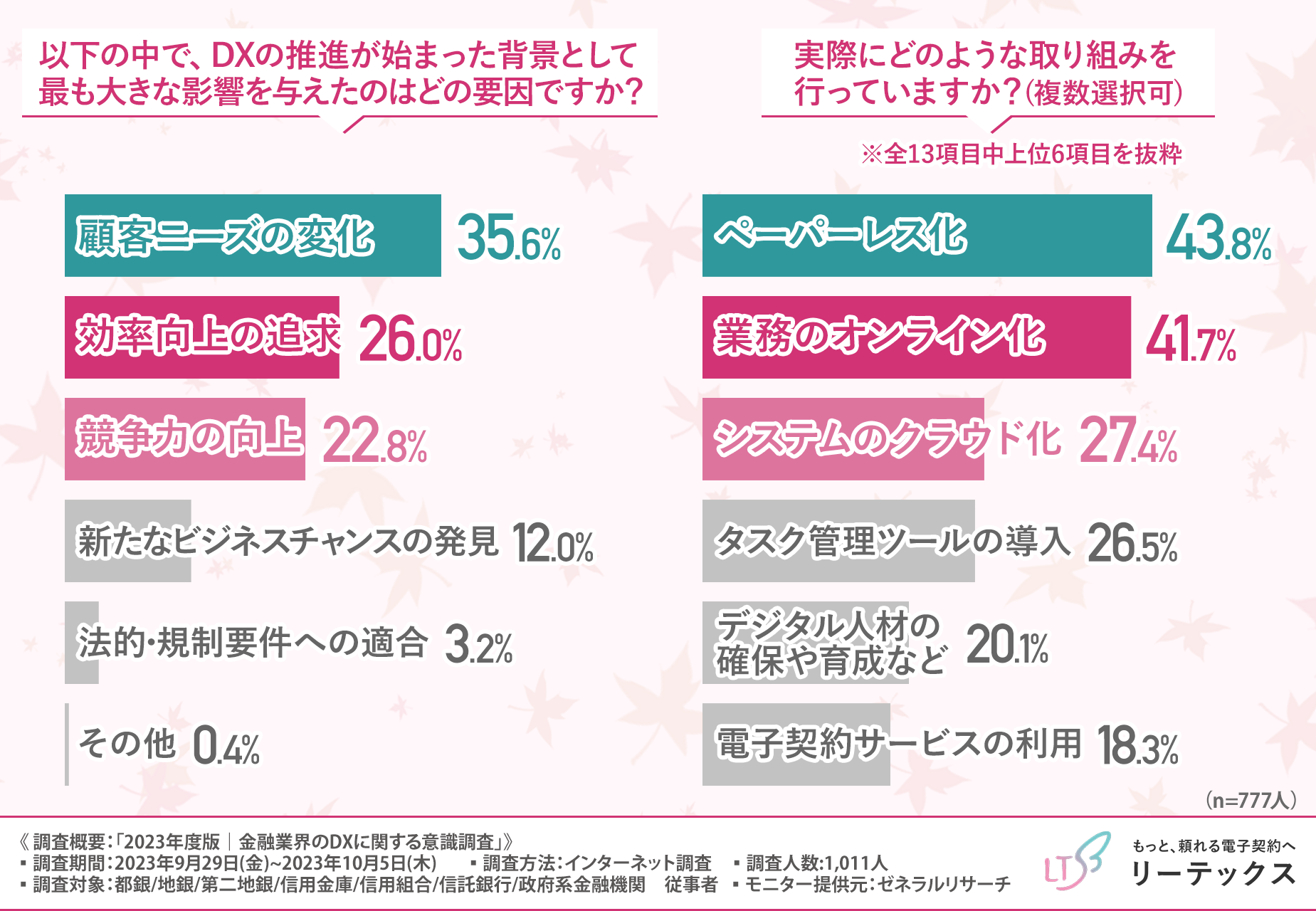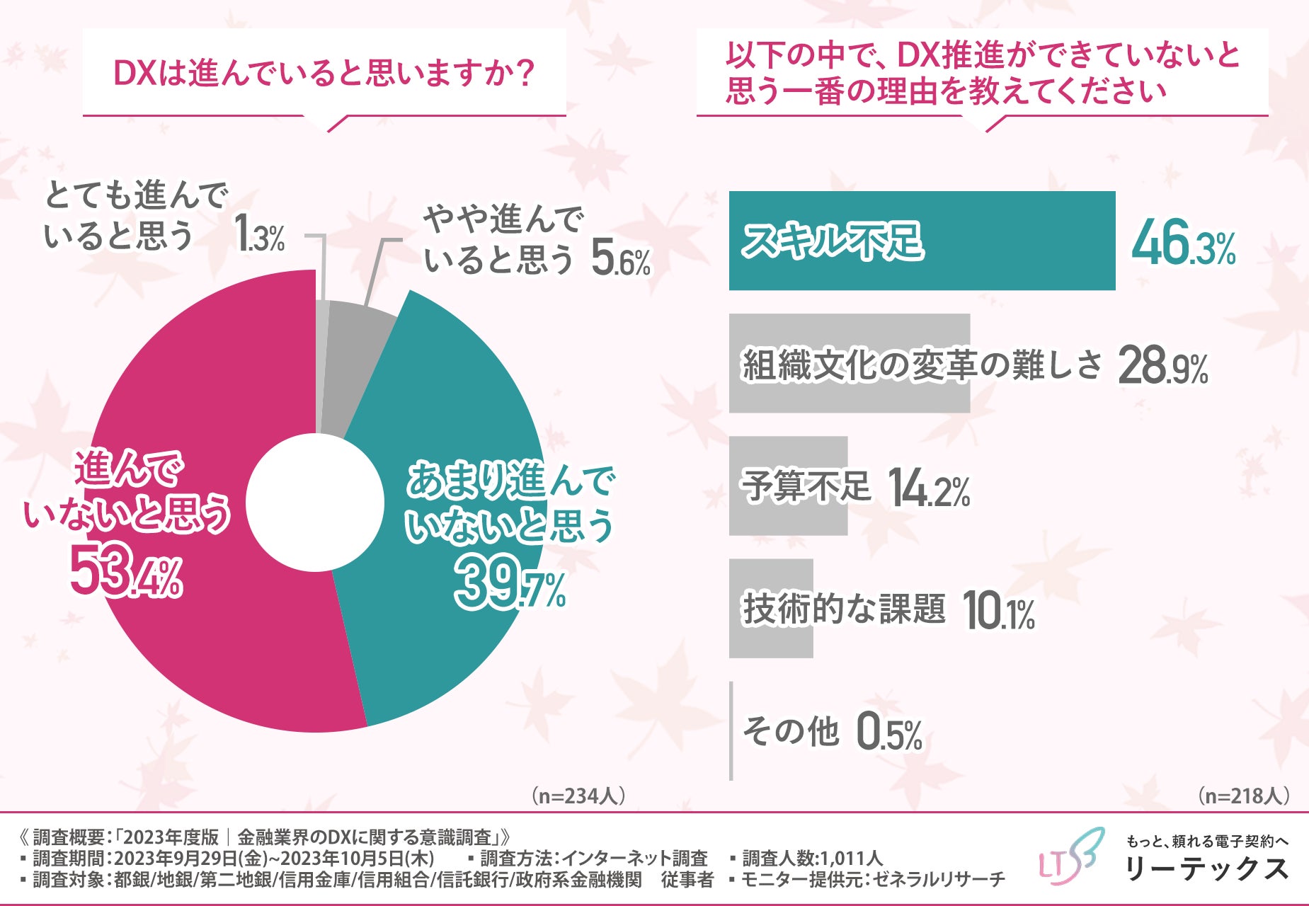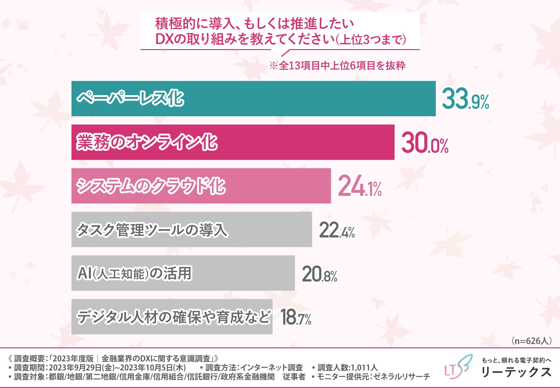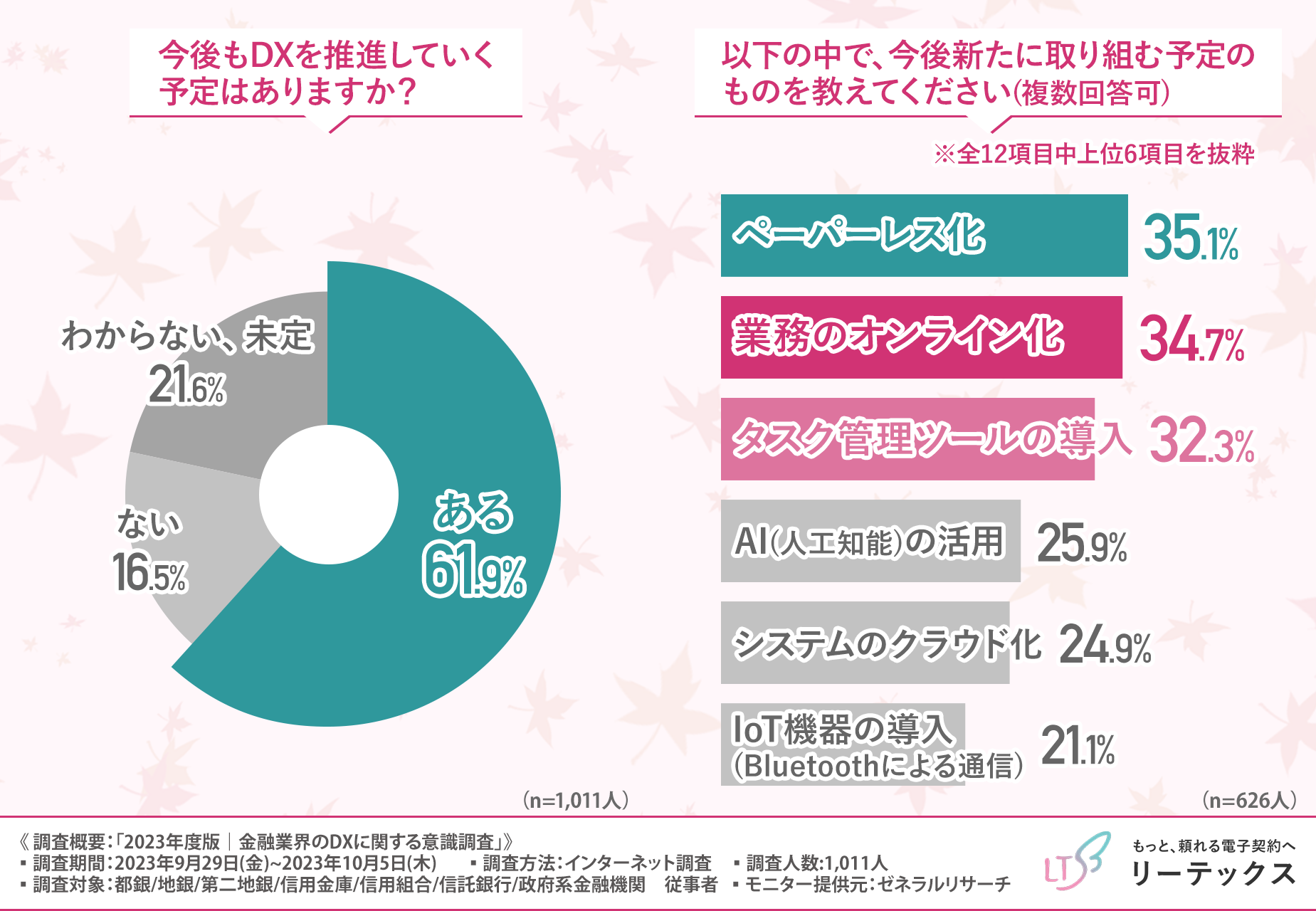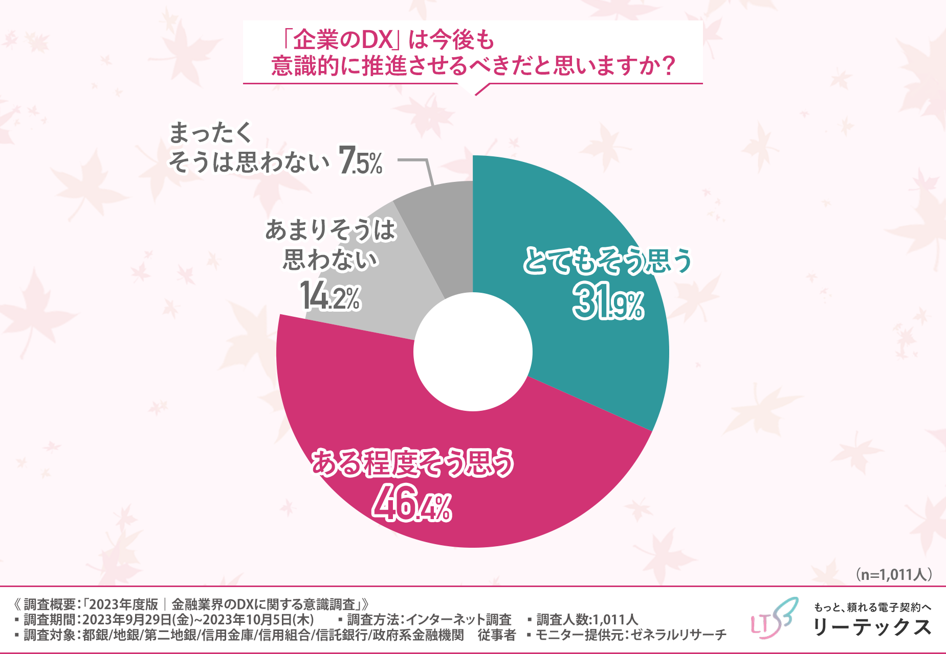 そこで今回、独自開発による日本で初めての超長期電子契約サービス『100年電子契約』(https://le-techs.com/100yr/)を提供するリーテックス株式会社は、金融業界に係わるビジネスパーソンを対象に「2023年度版|金融業界のDXに関する意識調査」を実施しました。