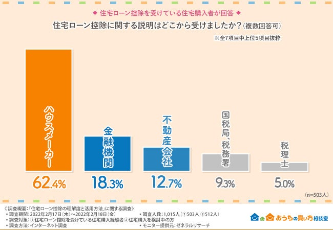 「住宅ローン控除に関する説明はどこから受けましたか? (複数回答可)」と質問したところ、『ハウスメーカー(62.4%)』と回答した方が最も多く、次いで『金融機関(18.3%)』『不動産会社(12.7%)』と続きました。