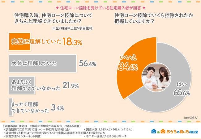 「住宅購入時、住宅ローン控除についてきちんと理解できていましたか?」と質問したところ、『完璧に理解していた(18.3%)』『大体は理解していた(56.4%)』『あまりよく理解できていなかった(21.9%)』『まったく理解できていなかった(3.4%)』という結果になりました。